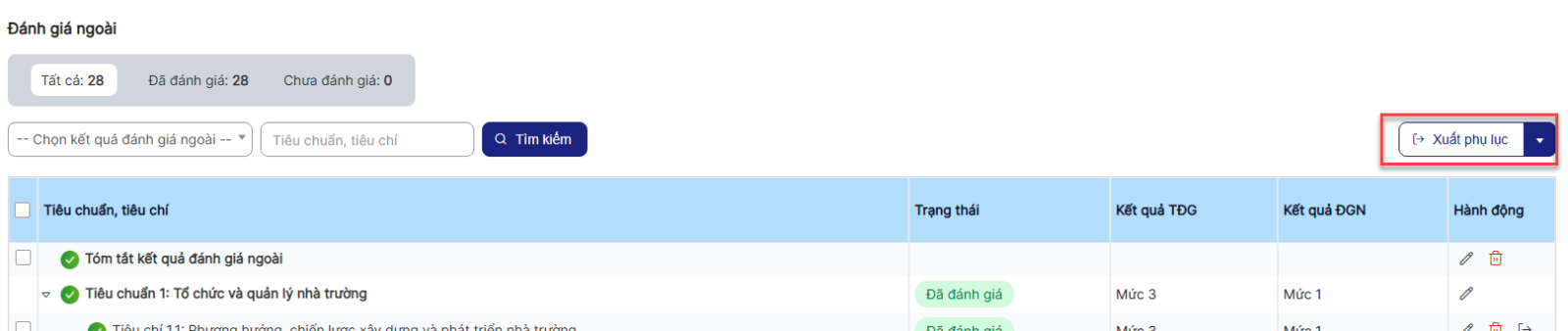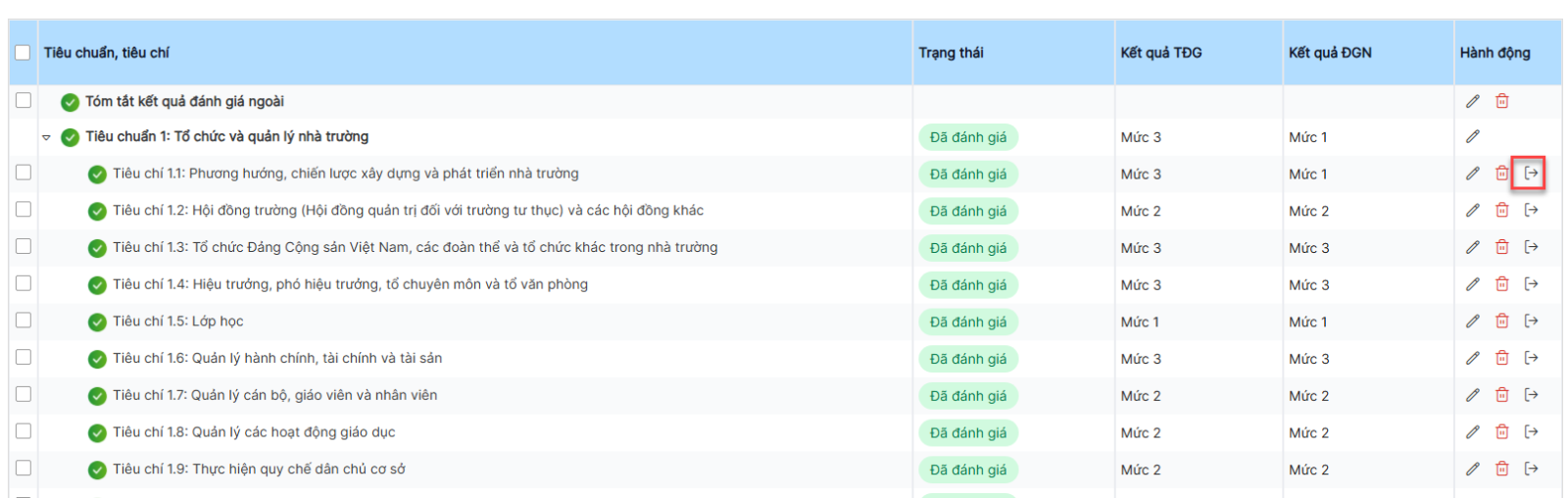 Bước 1: Trên màn hình danh sách> click icon Xuất phụ lục 9A của các tiêu chí thuộc tiêu chuẩn mức 1, 2, 3