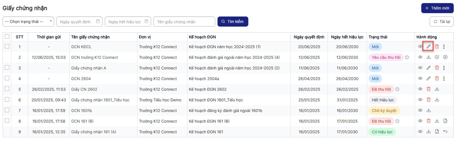 Bước 1: Trên màn hình danh sách> Click icon Chỉnh sửa của 1 bản ghi