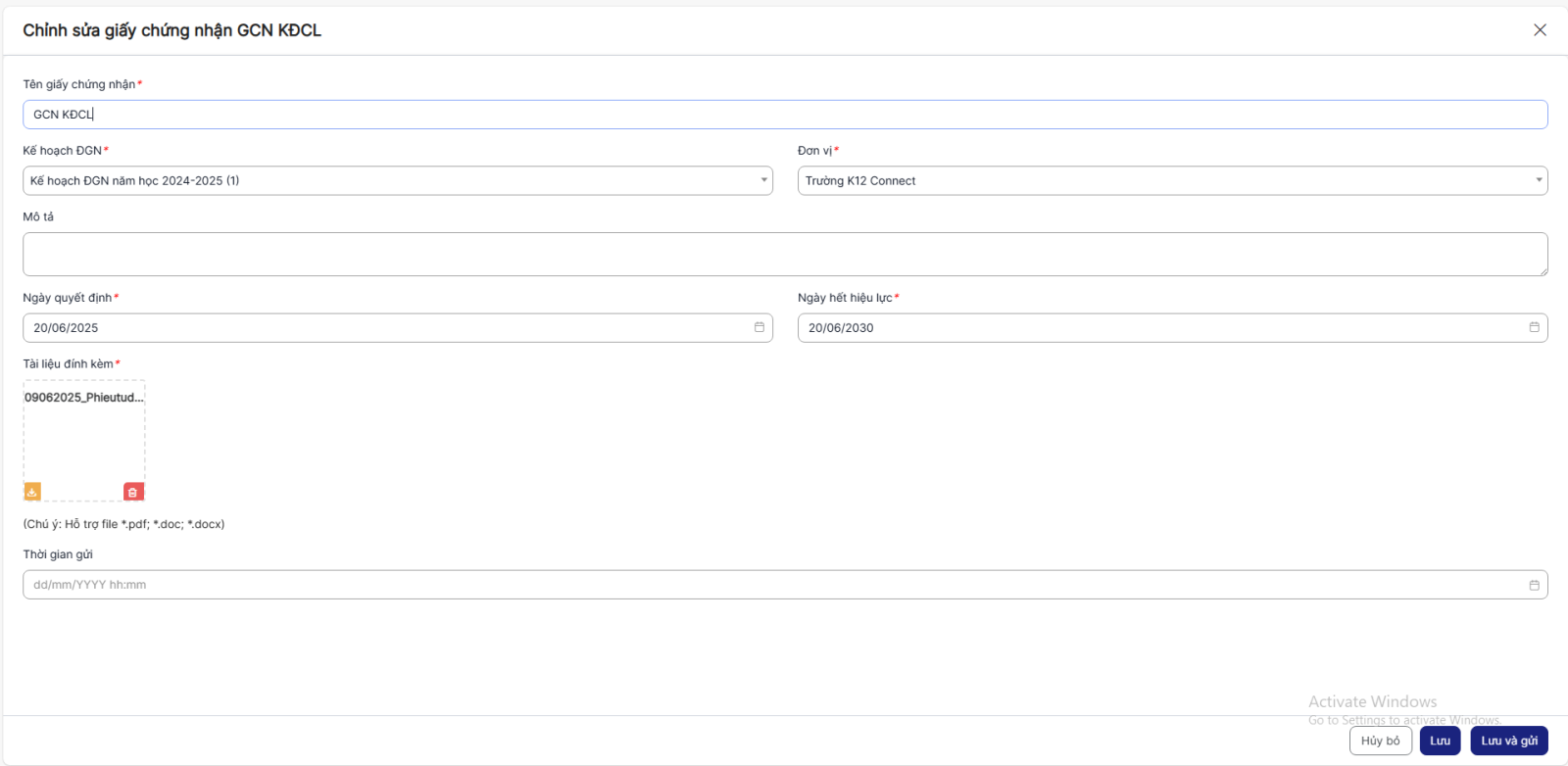 + Click Lưu và gửi để hoàn thành việc chỉnh sửa và đồng thời gửi bản ghi.