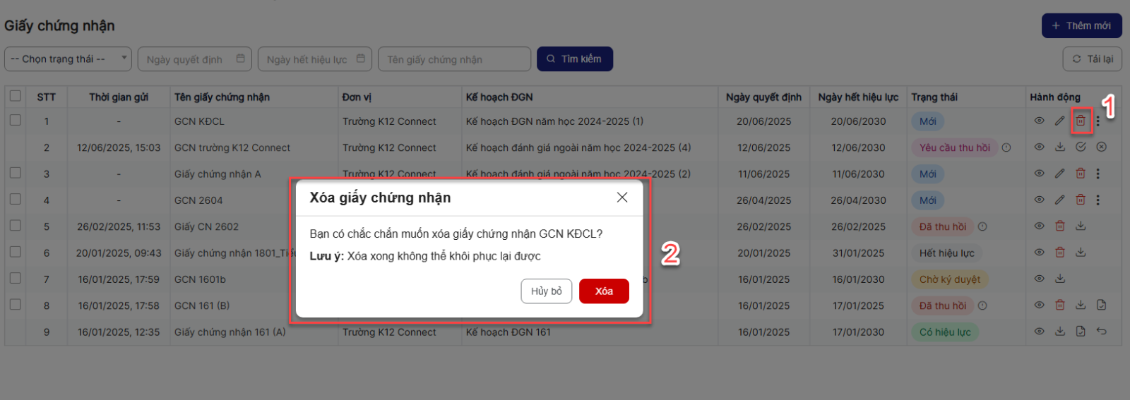 Bước 1: Trên màn hình danh sách > Click icon xóa một bản ghi > Hệ thống hiển thị popup xác nhận xóa