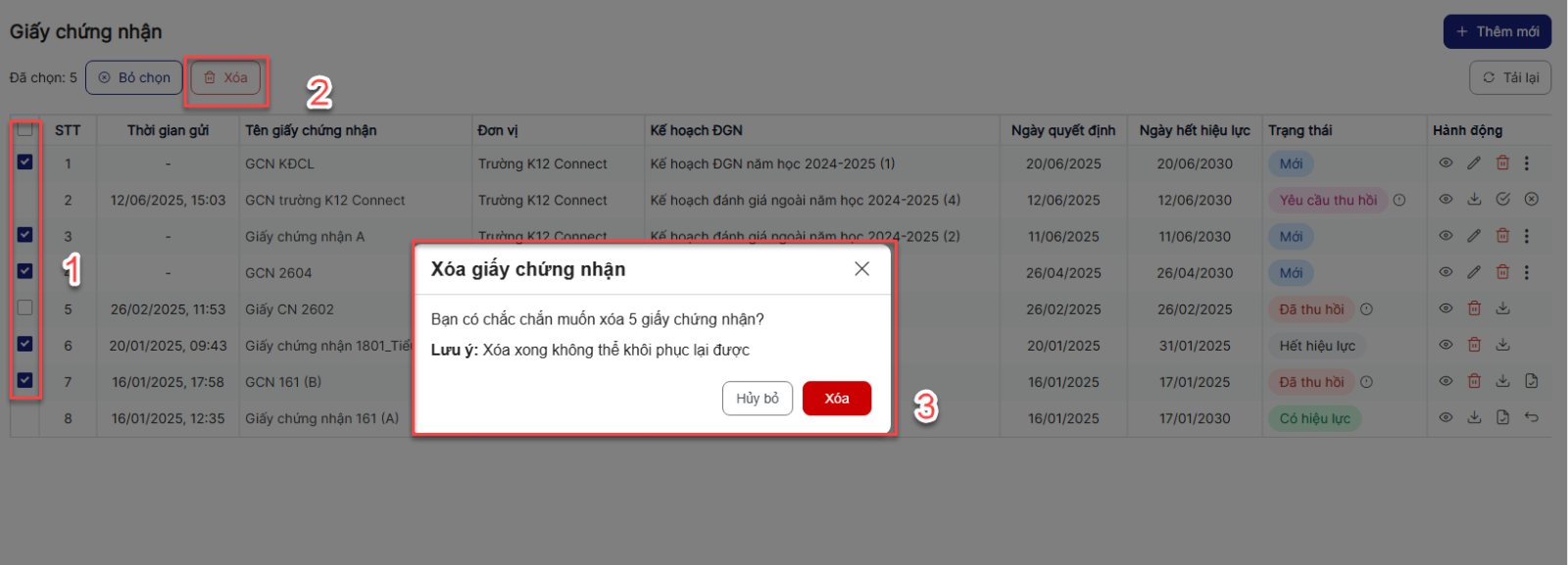 4. Xóa Giấy chứng nhận