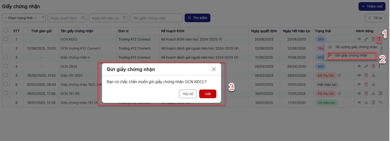 Bước 1: Trên màn hình danh sách > Click icon gửi giấy chứng nhận 1 bản ghi > Hệ thống hiển thị popup xác nhận gửi giấy chứng nhận
