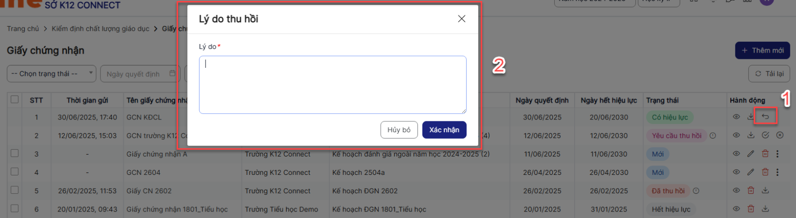 Bước 1: Trên màn hình danh sách > Click icon thu hồi một bản ghi > Hệ thống hiển thị popup Lý do thu hồi
