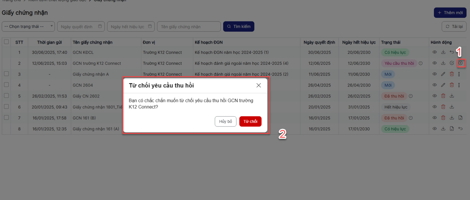 Bước 1: Trên màn hình danh sách > Click icon từ chối yêu cầu thu hồi một bản ghi > Hệ thống hiển thị popup xác nhận từ chối yêu cầu thu hồi