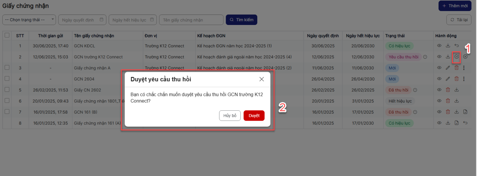 Bước 1: Trên màn hình danh sách > Click icon duyệt yêu cầu thu hồi một bản ghi > Hệ thống hiển thị popup xác nhận duyệt yêu cầu thu hồi
