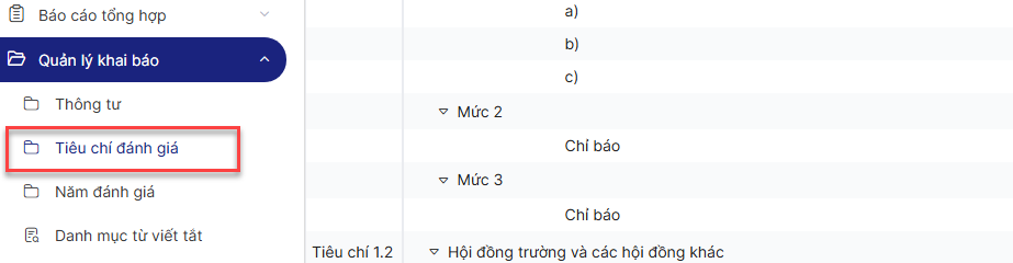 Bước 3: Click menu Quản lý khai báo > Tiêu chí đánh giá