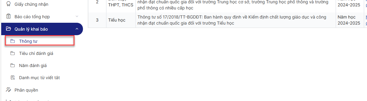 Bước 3: Click menu Quản lý khai báo > Thông tư
