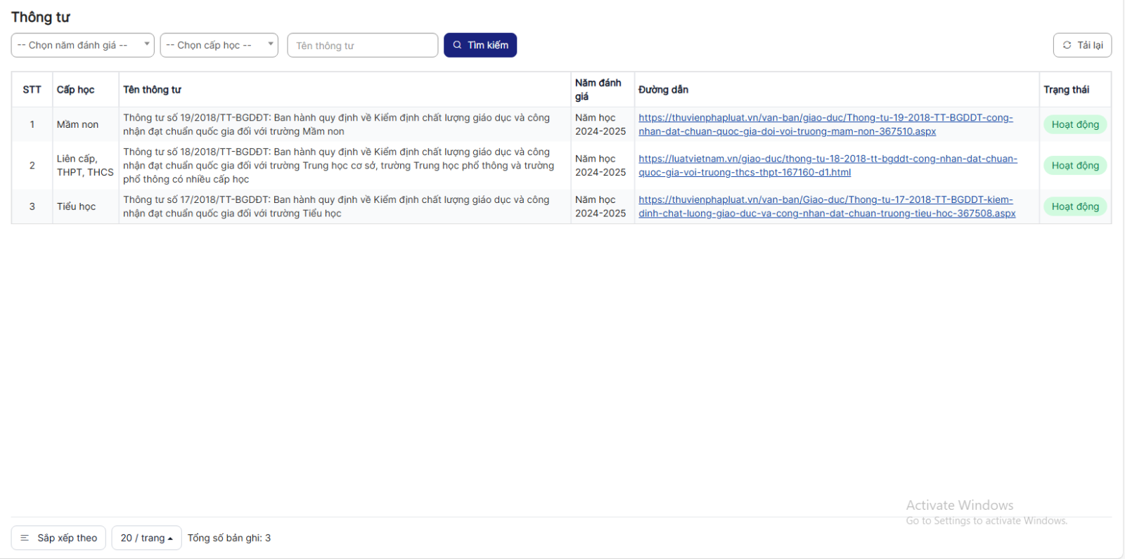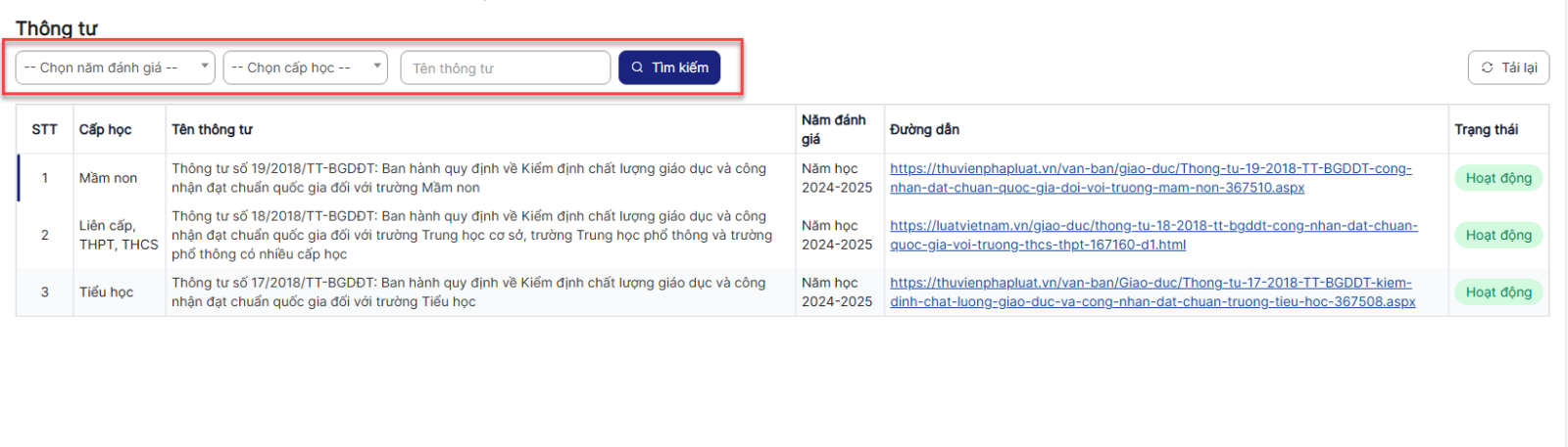 Bước 4: Hiển thị danh sách Thông tư