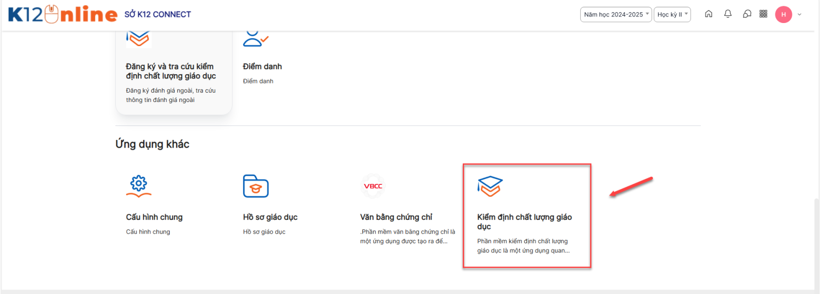 Bước 2: Click Ứng dụng Kiểm định chất lượng giáo dục