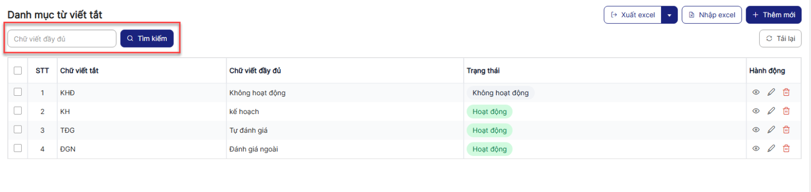 Bước 1: Trên màn hình danh sách> Tại vùng tìm kiếm: chọn/nhập tiêu chí tìm kiếm > Click button Tìm kiếm để thực hiện tìm kiếm Danh mục từ viết tắt