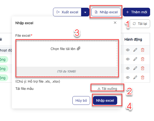 Bước 1: Trên màn hình danh sách> click Nhập excel > Tải file mẫu > nhập dữ liệu vào file mẫu > tải file lên > click Nhập excel