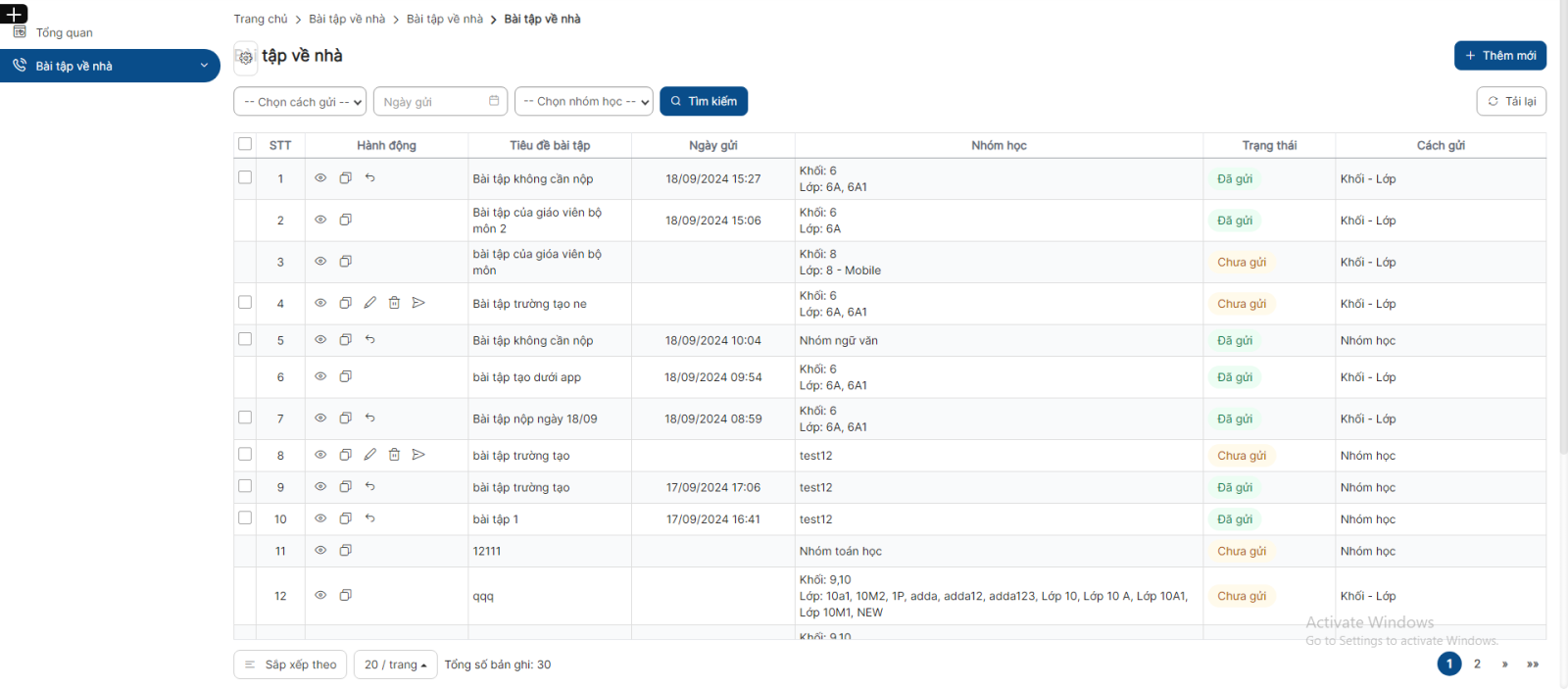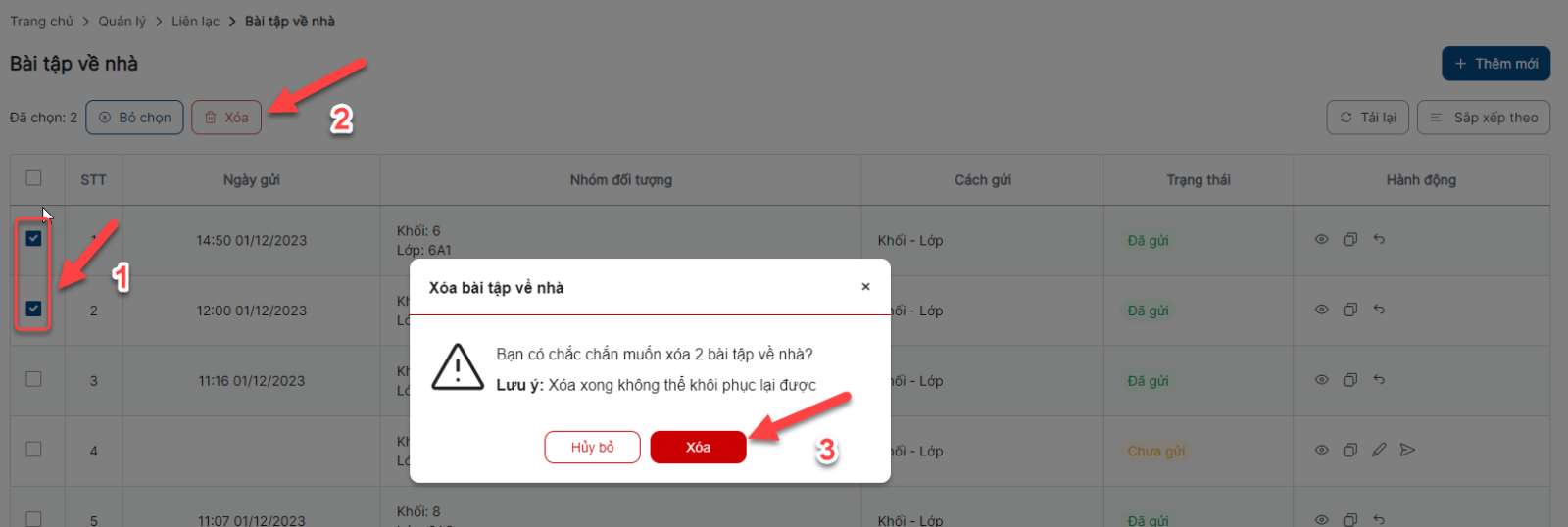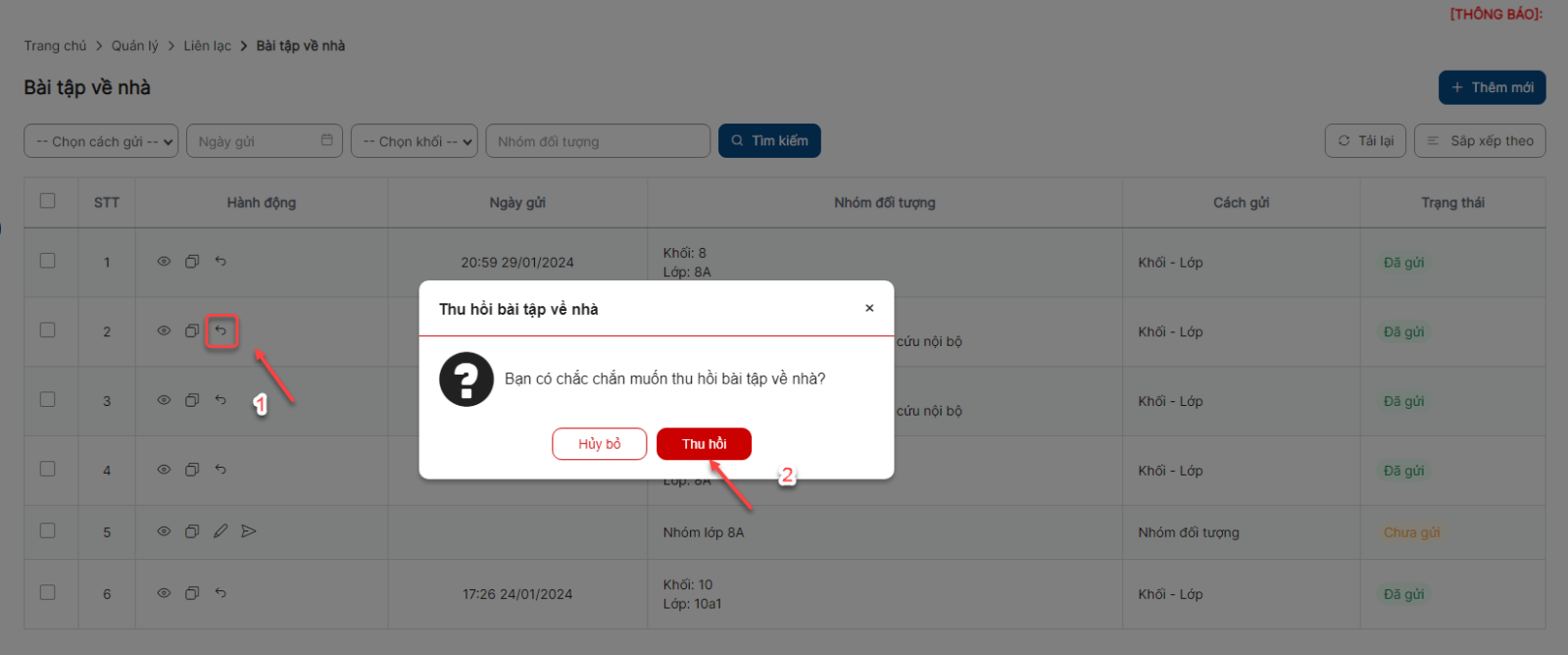 Danh sách > Click icon thu hồi bài tập về nhà > Click Thu hồi thực hiện thu hồi thành công và bản ghi chuyển sang trạng thái Chưa gửi