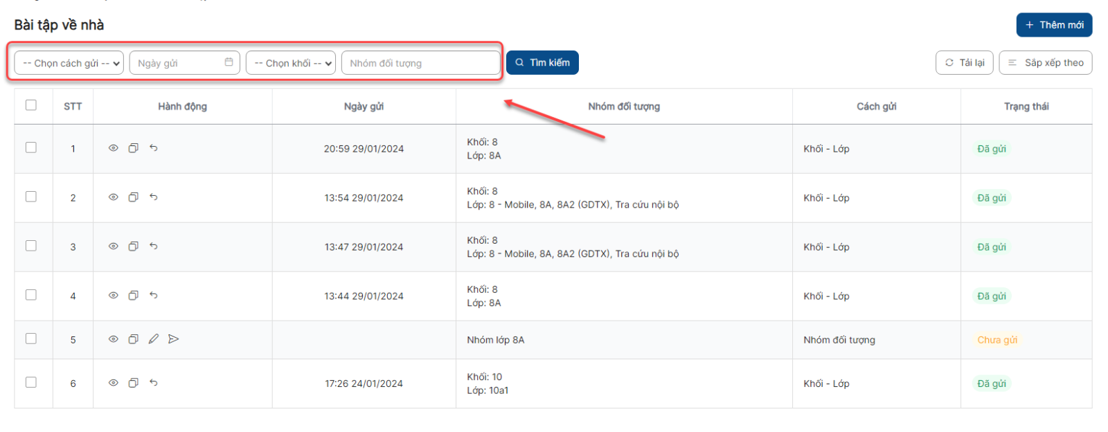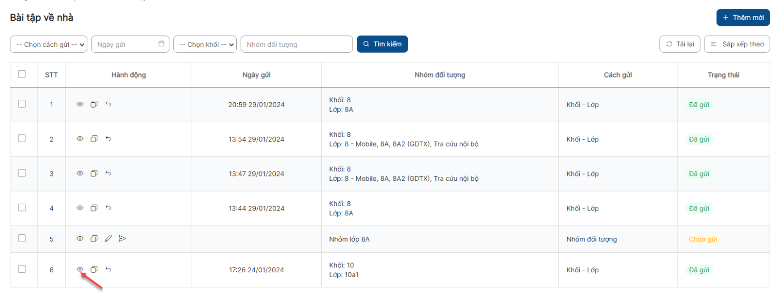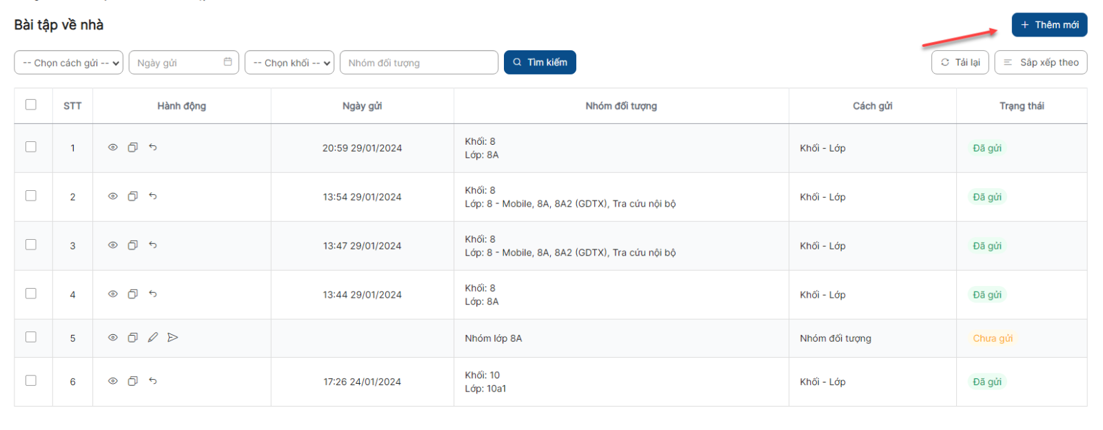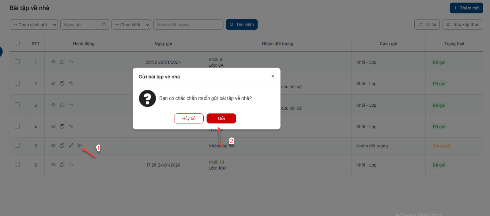 Danh sách > Click icon thu hồi bài tập về nhà > Click Thu hồi thực hiện thu hồi thành công và bản ghi chuyển sang trạng thái Chưa gửi