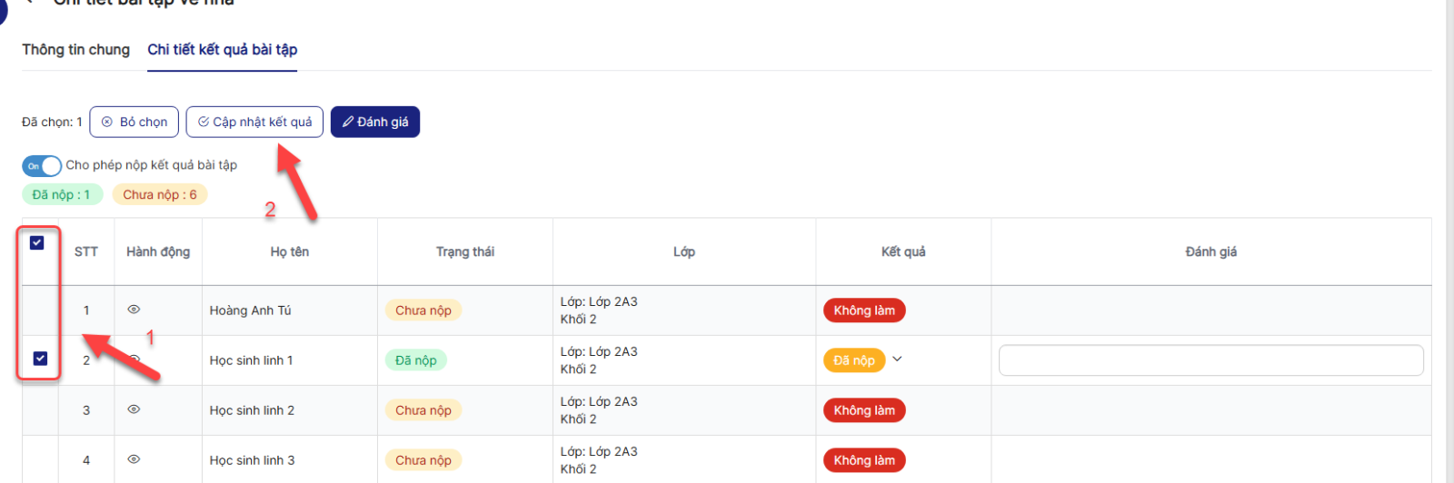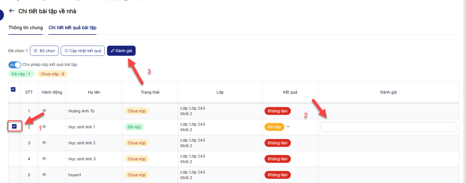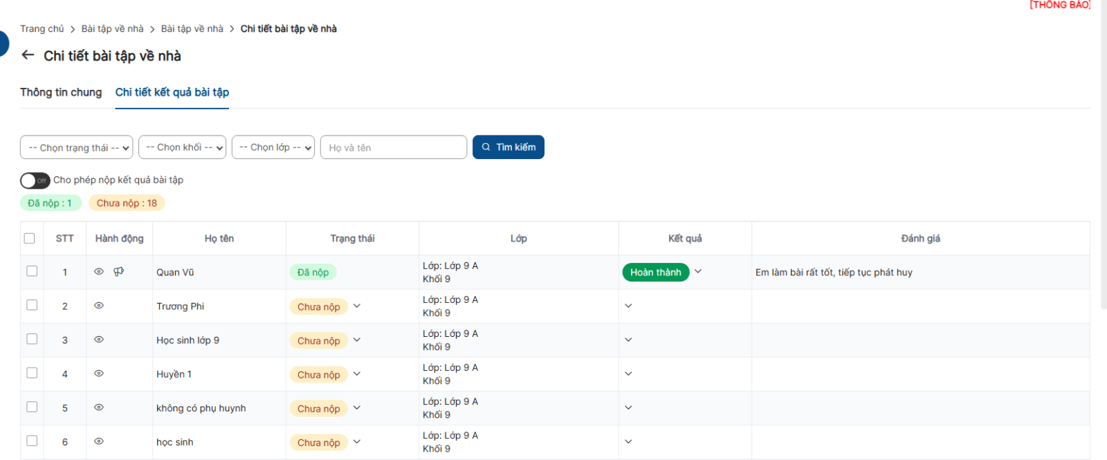 - Chỉ những bài tập phụ huynh đã nộp thì giáo viên mới được đánh giá