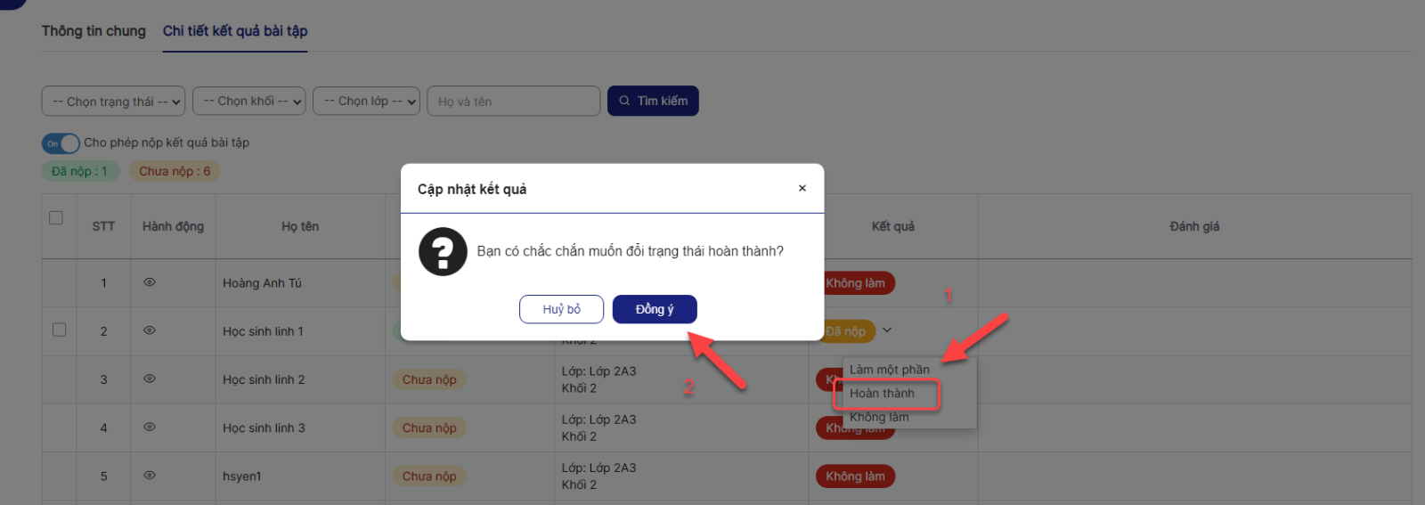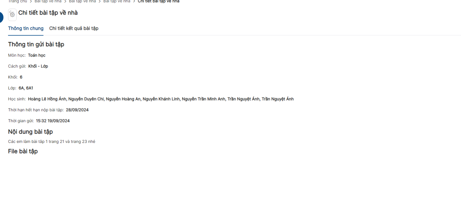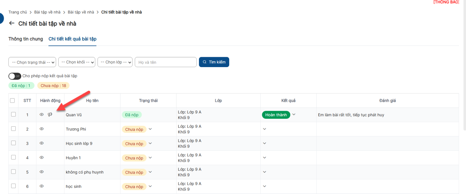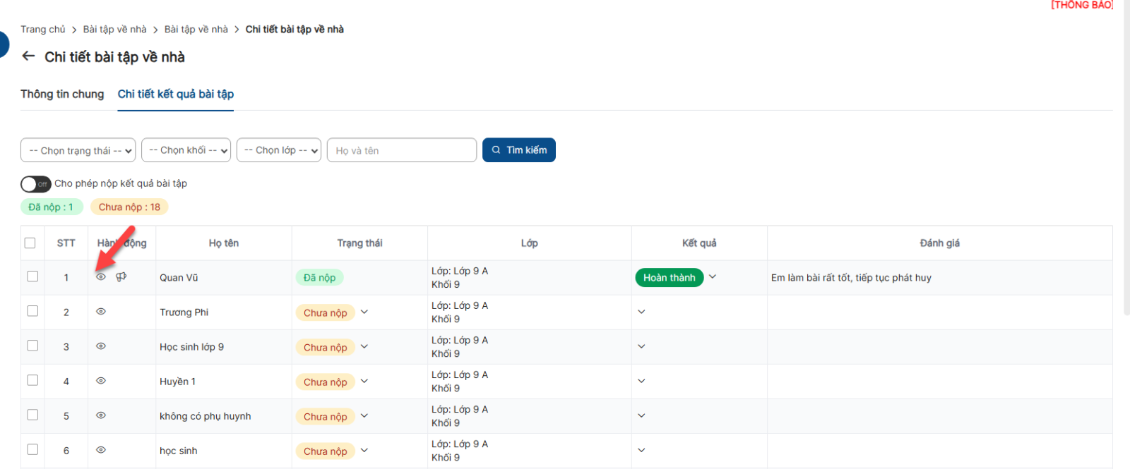 Bước 1 : Danh sách > Click xem chi tiết > Click Chi tiết kết quả bài tập : Hiển thị danh sách học sinh được giao bài tập
