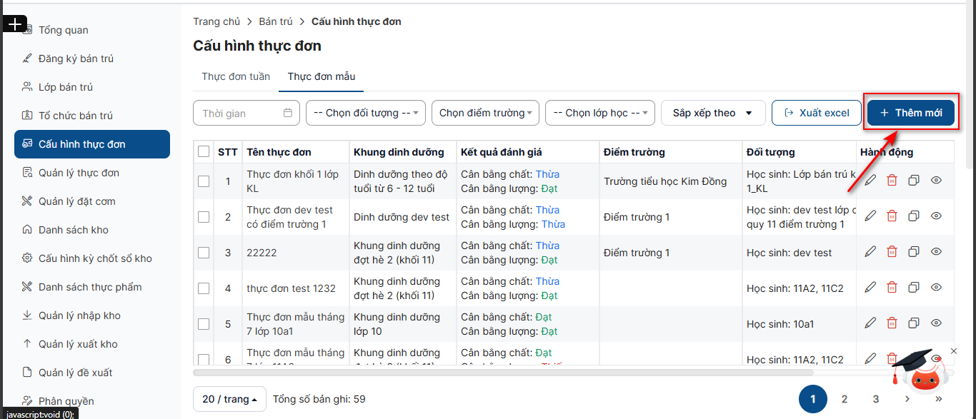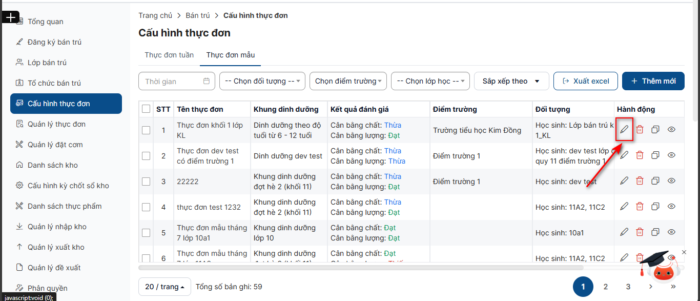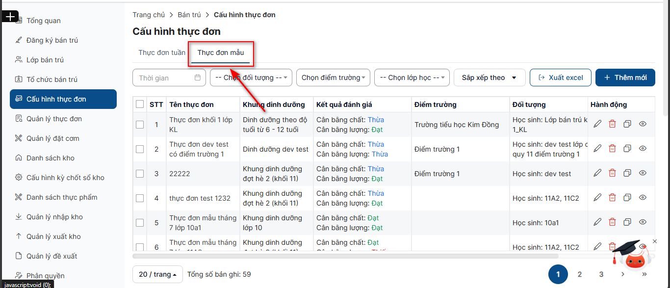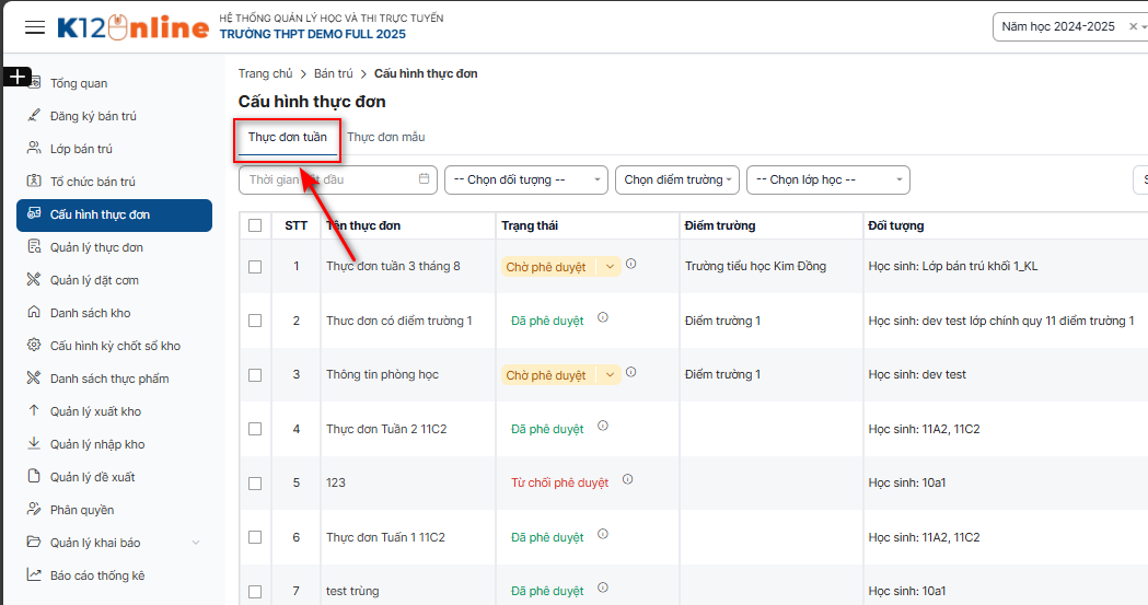 Trên menu chọn Cấu hình thực đơn > Chọn Thực đơn tuần > Màn hình hiển thị danh sách bản ghi