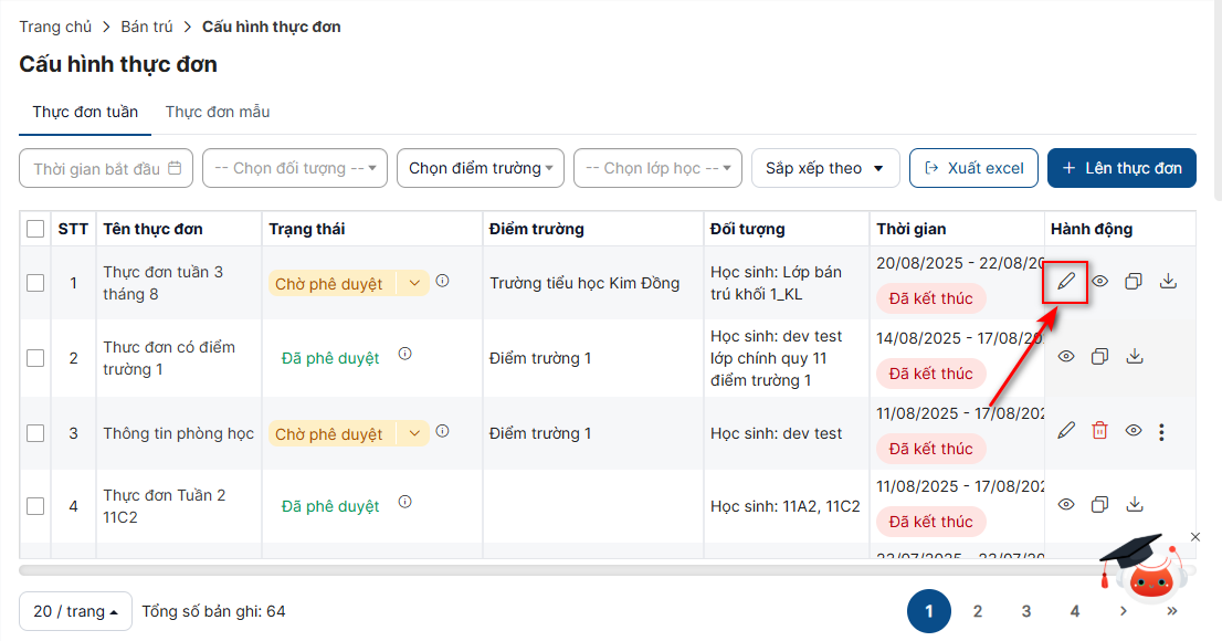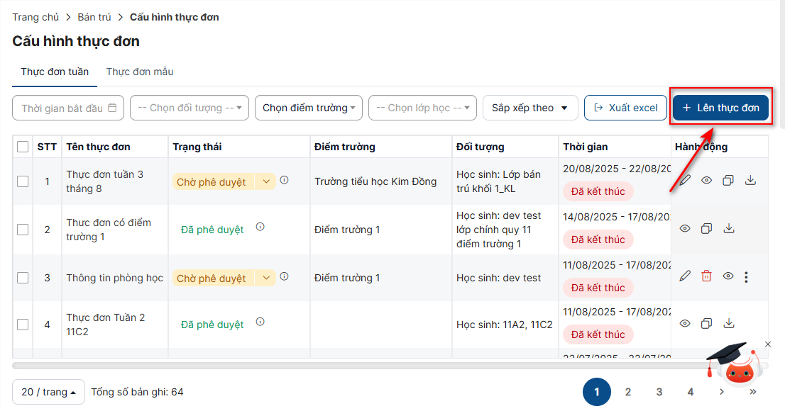 Thực đơn tuần sau khi được duyệt sẽ hiển thị trên danh sách thực đơn cả học sinh/ cán bộ trên Quản lý thực đơn