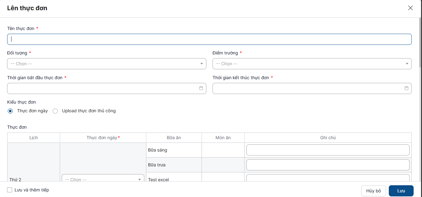 Bước 1: Trên màn hình, chọn Lên thực đơn -> màn hình hiển thị biểu mẫu lên thực đơn
