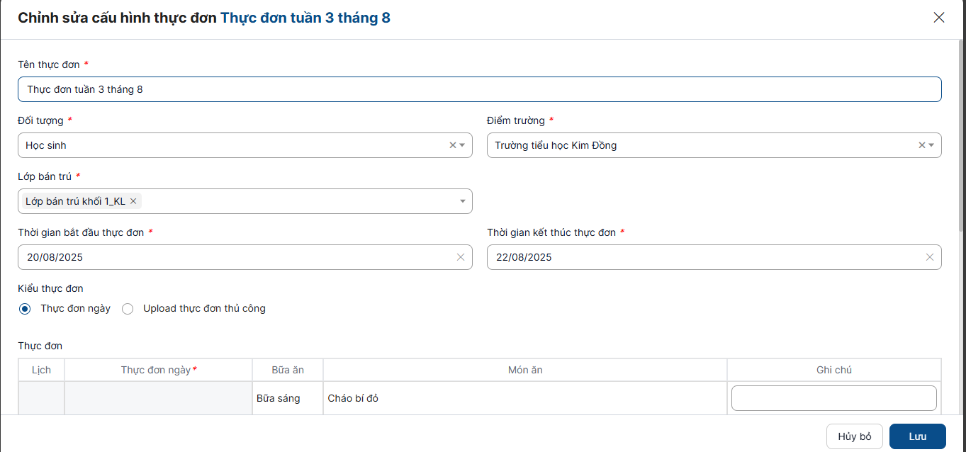 - Chọn kiểu thực đơn ngày lấy dữ liệu từ Thực đơn mẫu