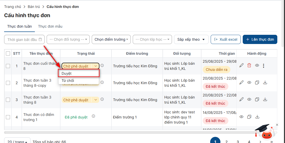 - Chọn duyệt để thực hiện duyệt cấu hình thực đơn thành công, bản ghi chuyển sang trạng thái Đã duyệt