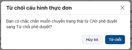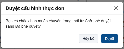 - Chọn Hủy bỏ để đóng thông báo duyệt, hủy việc duyệt cấu hình thực đơn