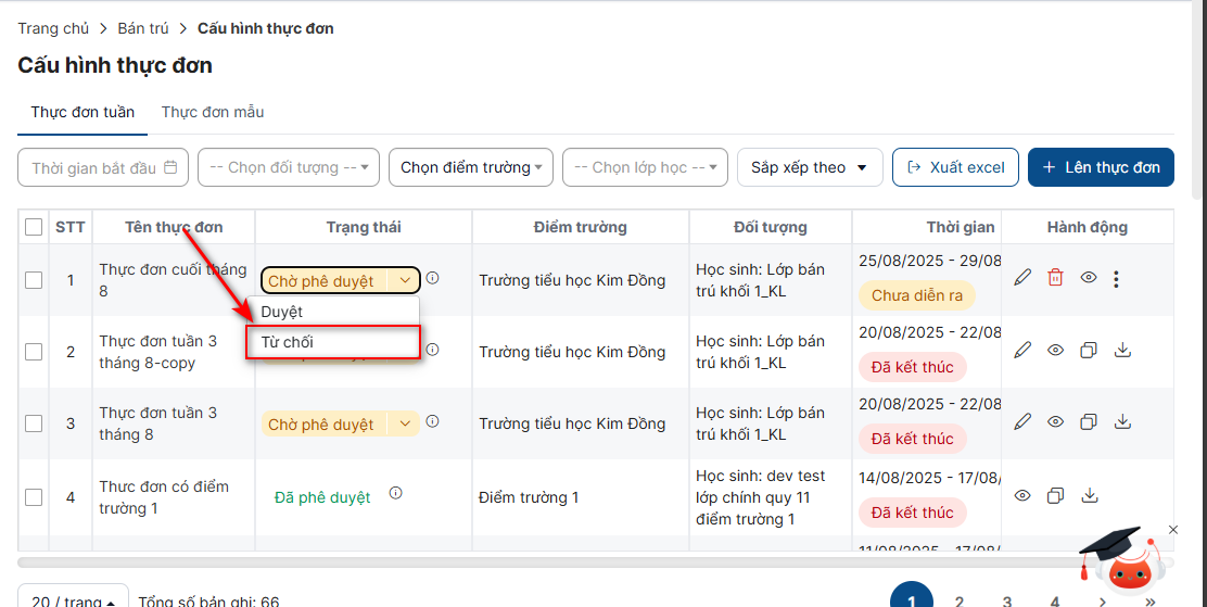 - Chọn từ chối để thực hiện từ chối cấu hình thực đơn thành công, bản ghi chuyển sang trạng thái Từ chối phê duyệt