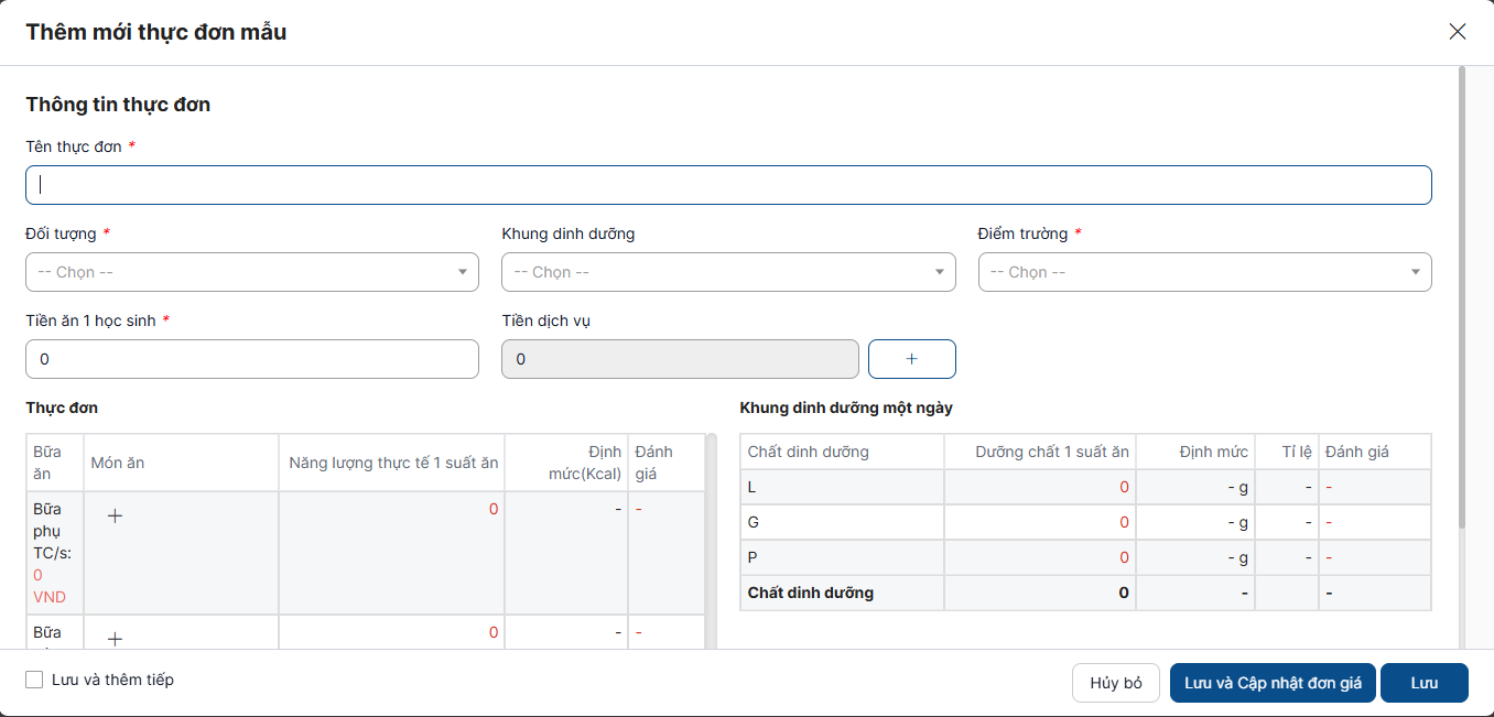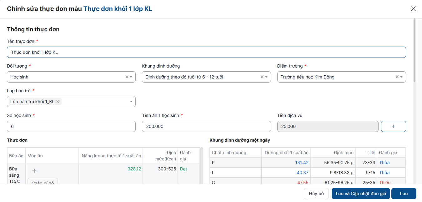 - Chọn Lưu và cập nhật đơn giá thì đơn giá của thực phẩm sẽ được cập nhật đúng với đơn giá đã nhập trong thực đơn mẫu