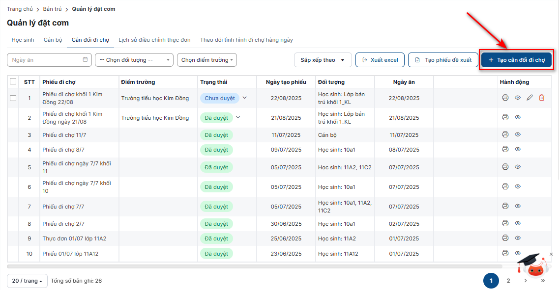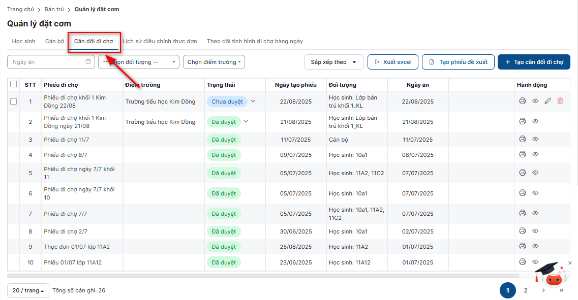 Trên menu chọn Quản lý đặt cơm > Cân đối đi chợ > Màn hình hiển thị danh sách bản ghi