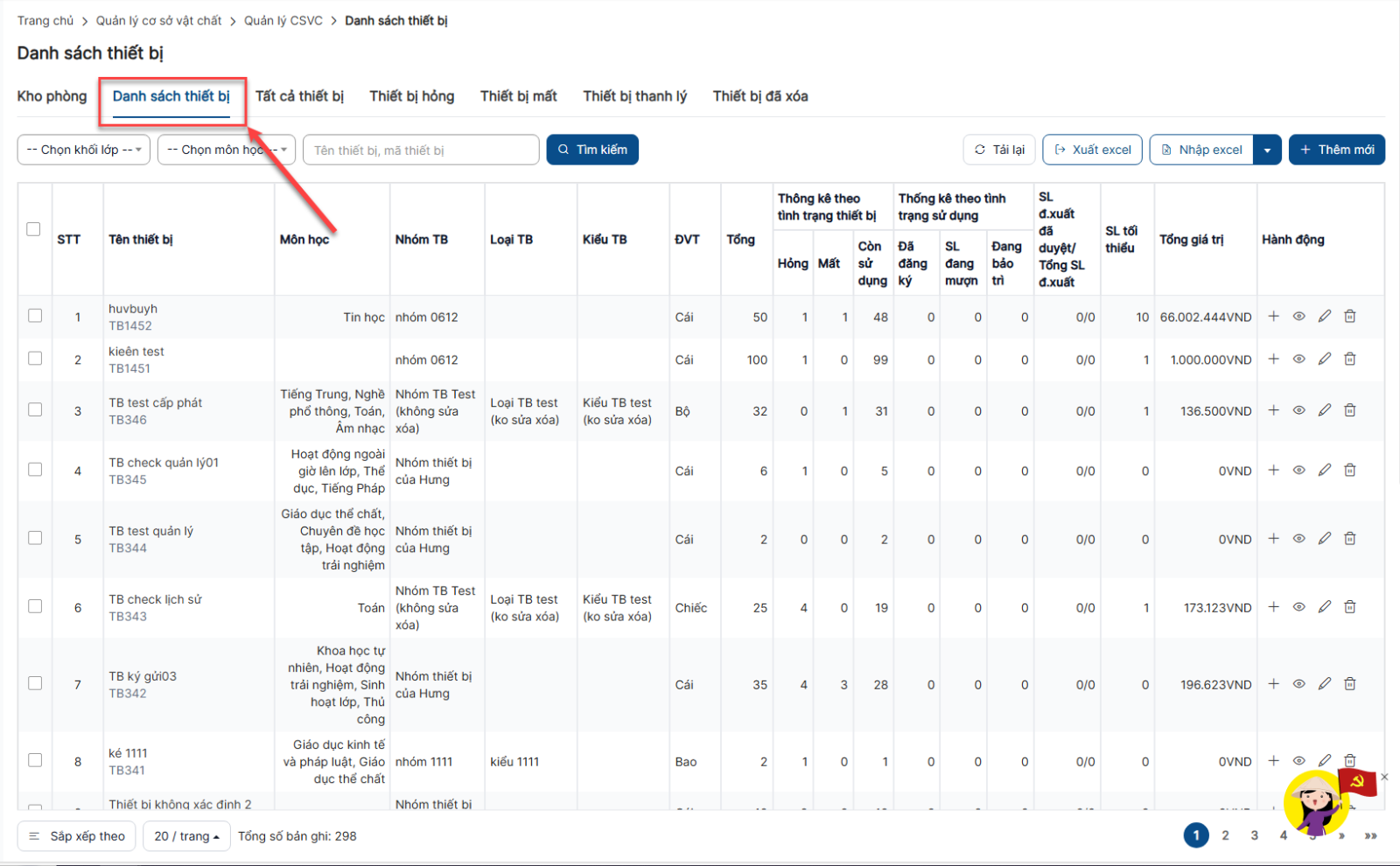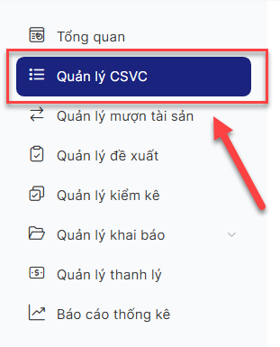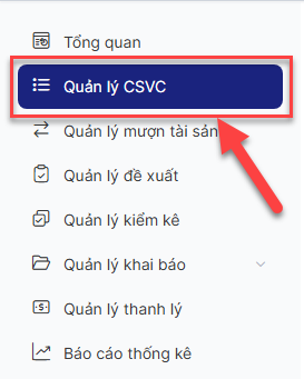 Bước 1: Menu Quản lý CSVC > Click tab Danh sách thiết bị
