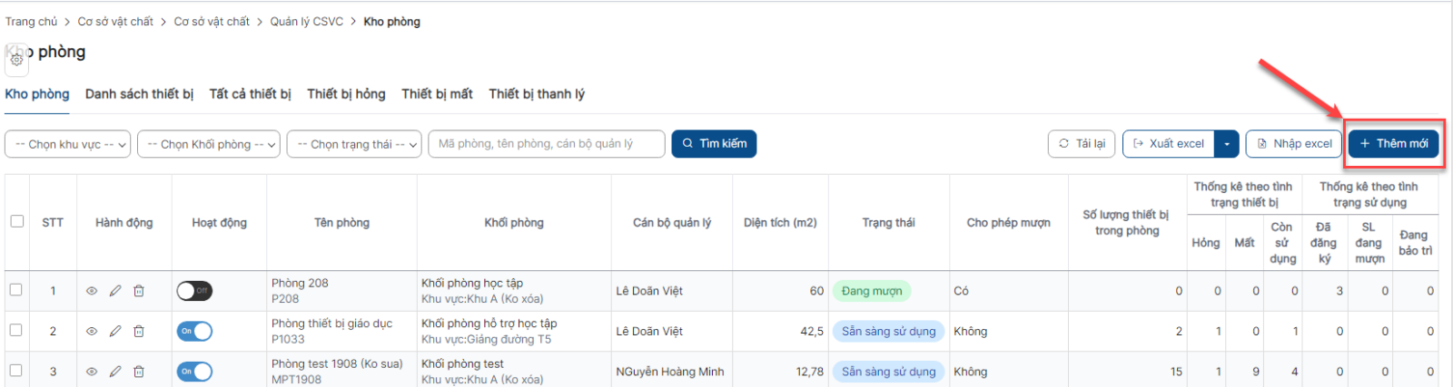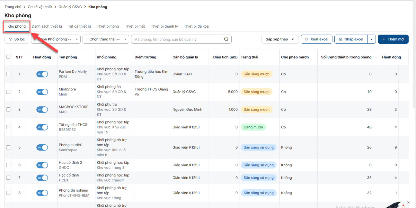 Bước 1: Menu Quản lý CSVC > Chọn tab Kho phòng