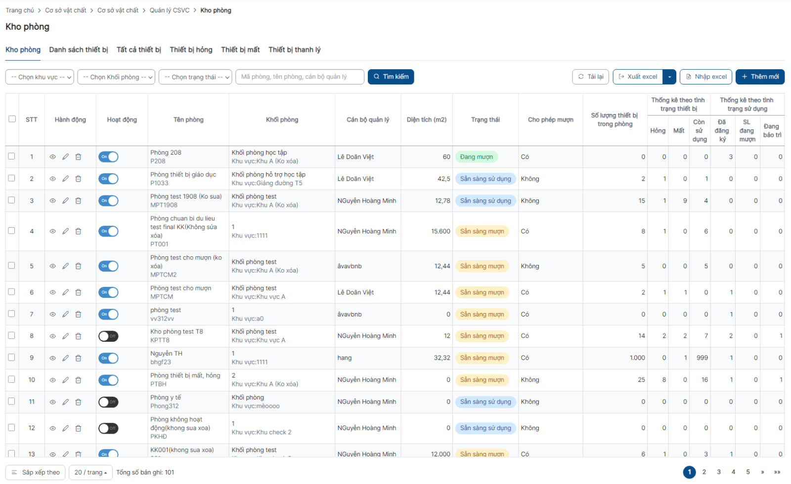 - Click icon On/Off đề thay đổi tình trạng Hoạt động/Không hoạt động của Kho phòng