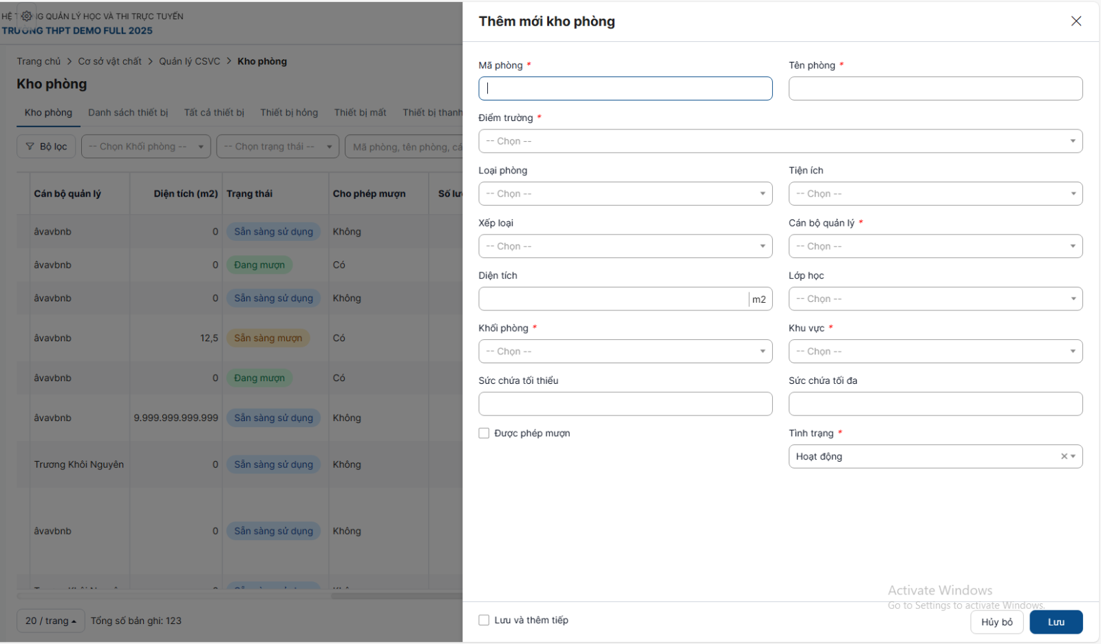- Cán bộ quản lý: Chọn cán bộ quản lý cho Kho phòng (chỉ các tài khoản có quyền quản lý cơ sở vật chất)
