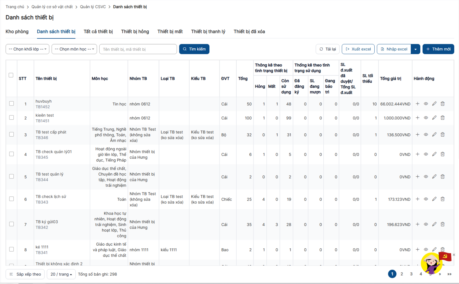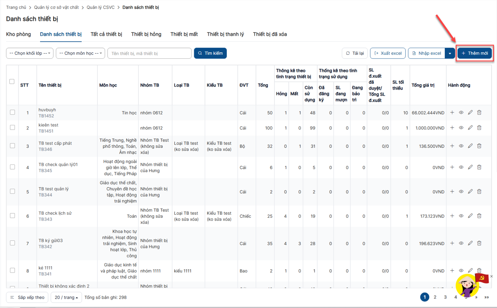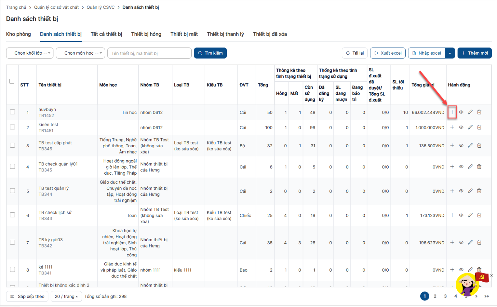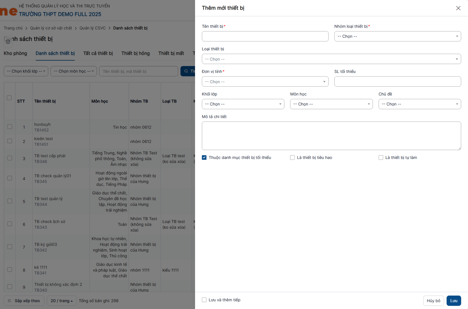 - Checkbox Thuộc danh mục thiết bị tối thiểu: Xác định thiết bị thuộc trong danh mục phải có