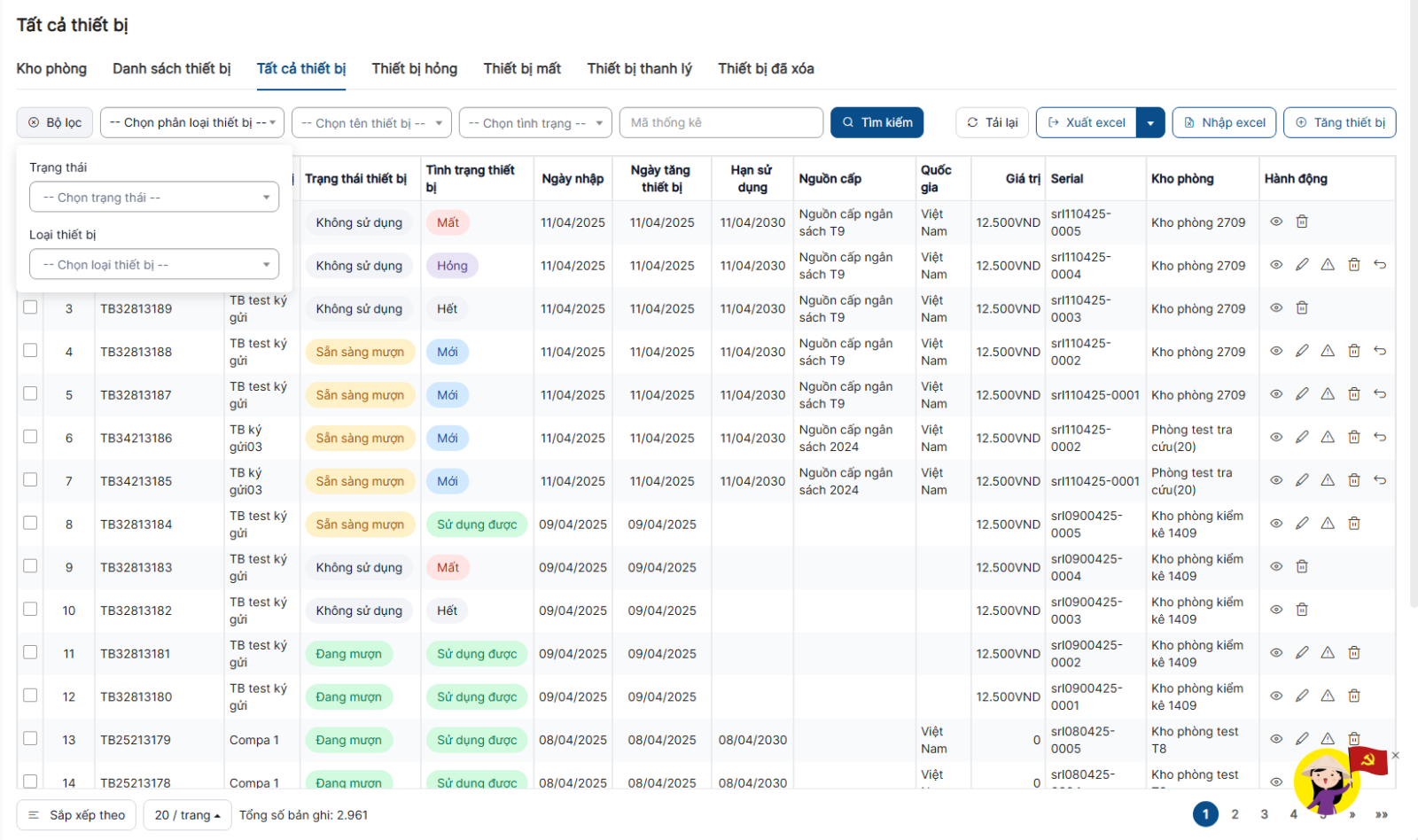 + Click Lưu để hoàn thành việc tăng thiết bị, cập nhật thống kê số lượng thiết bị ở ngoài bảng danh sách