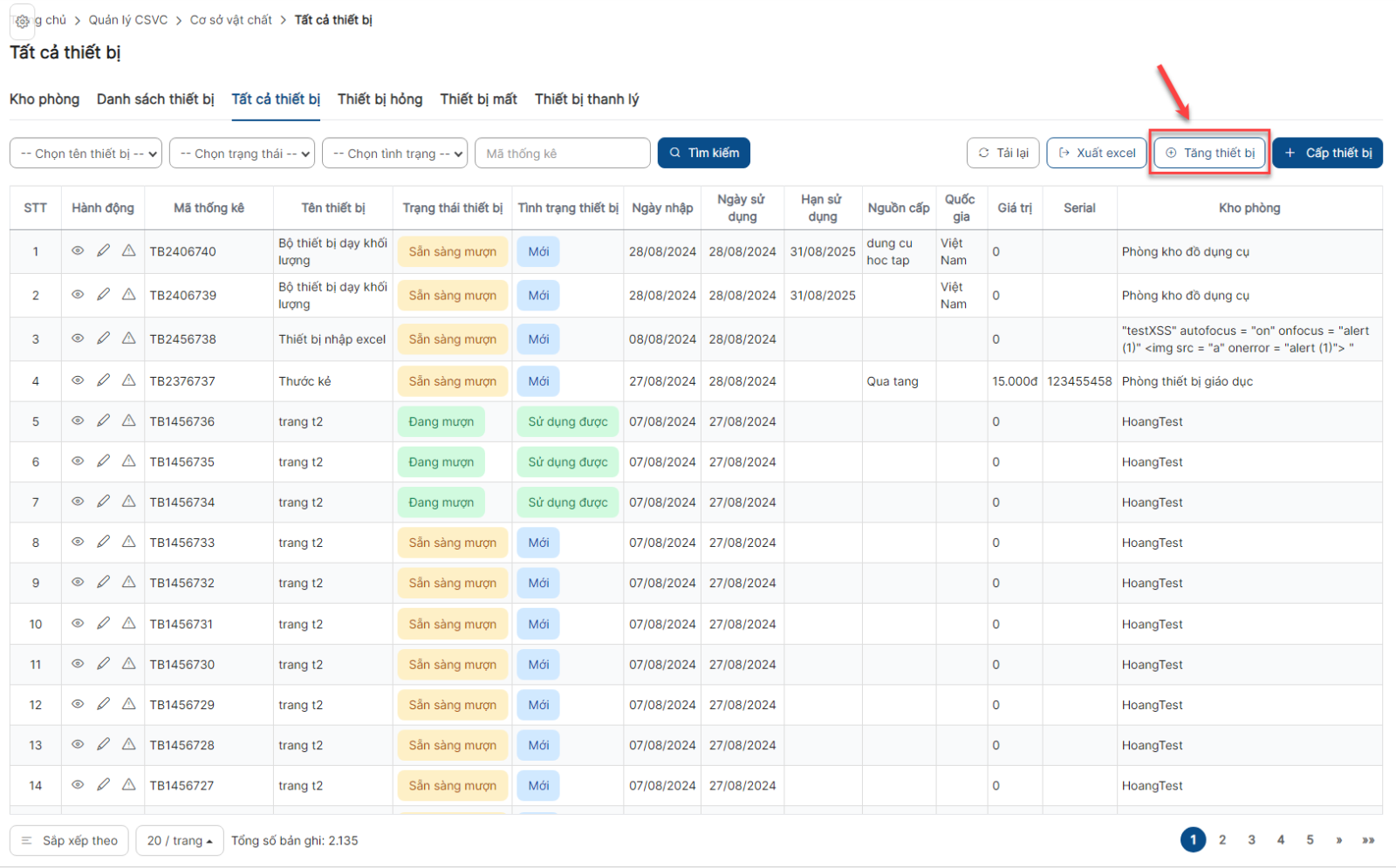 Bước 1: Menu Quản lý CSVC > Click tab Tất cả thiết bị