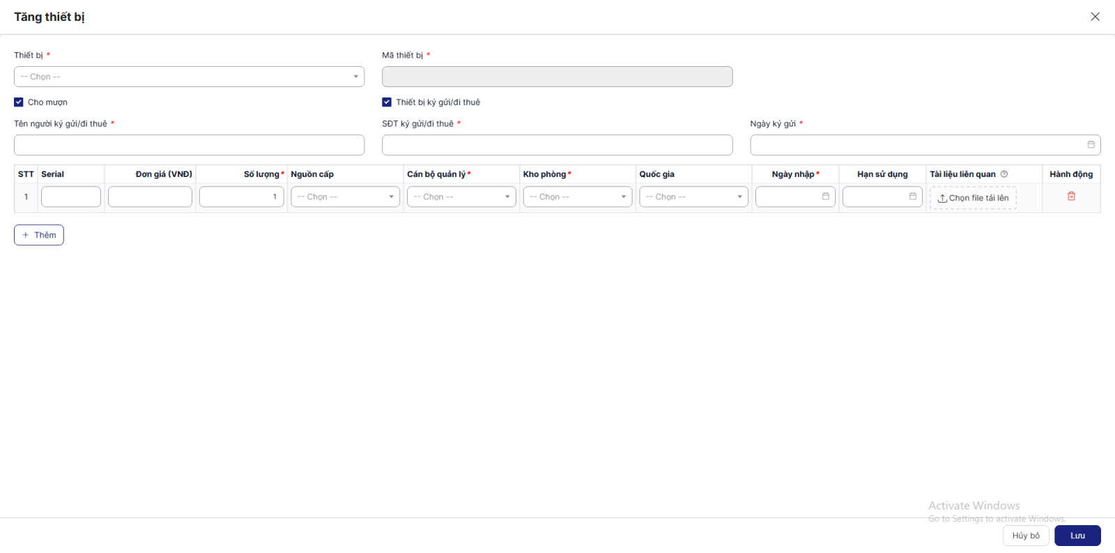 - Màn hình Tăng thiết bị khi tích chọn Checkbox Thiết bị ký gửi/đi thuê: