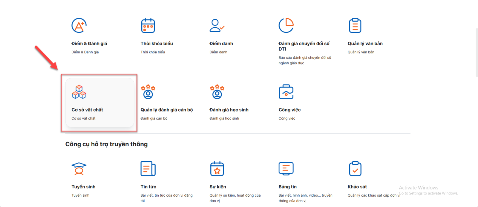 Bước 2: Trang chủ > Click module Cơ sở vật chất