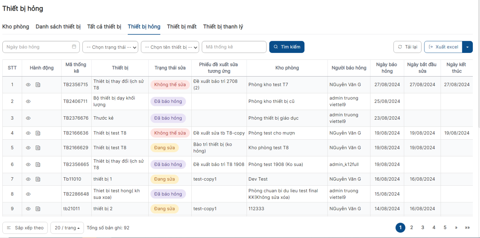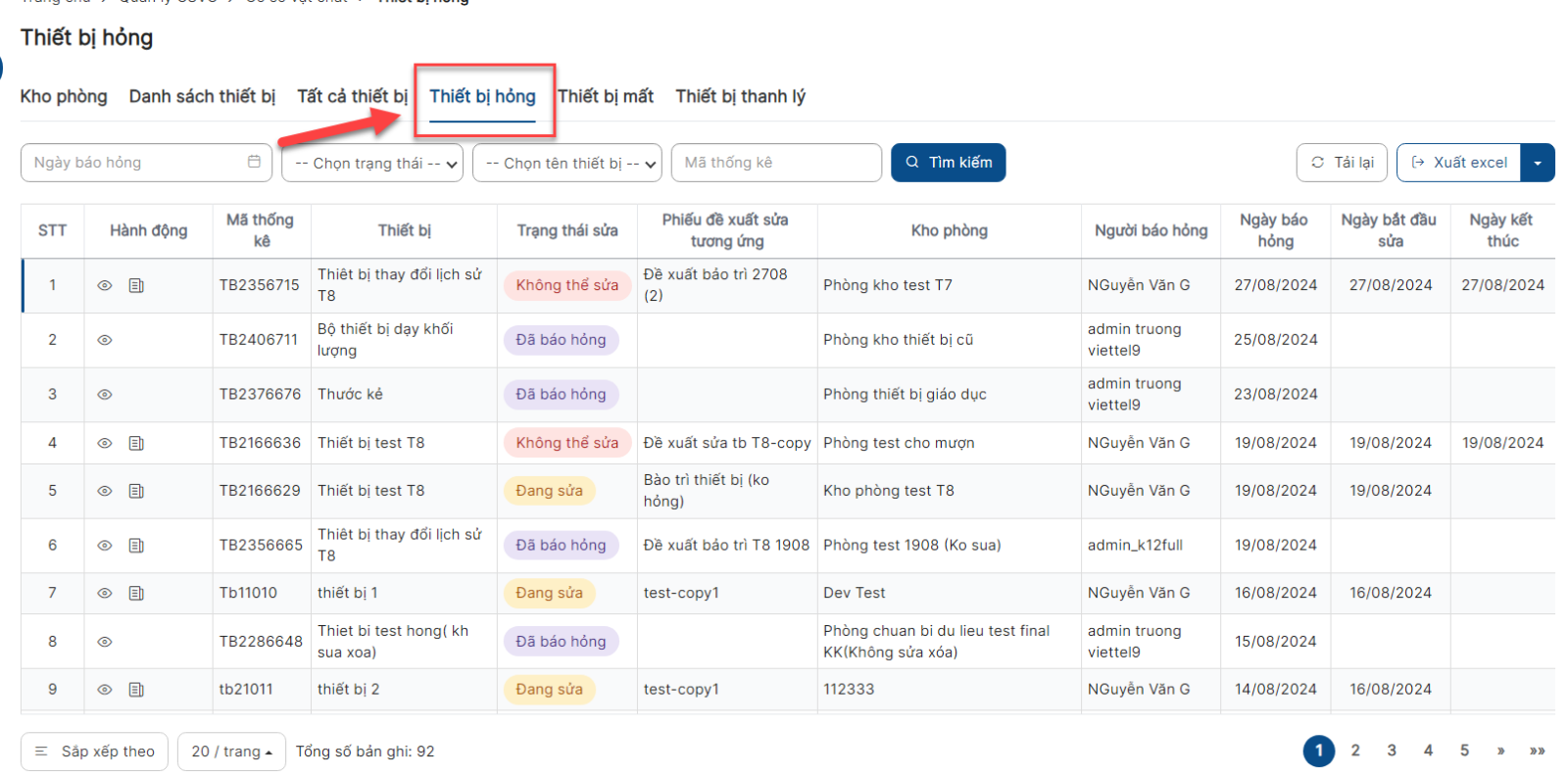 Bước 1: Menu Quản lý CSVC > Click tab Thiết bị hỏng