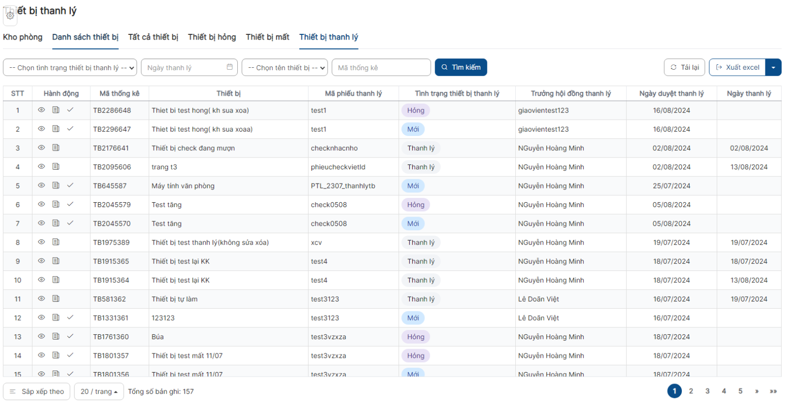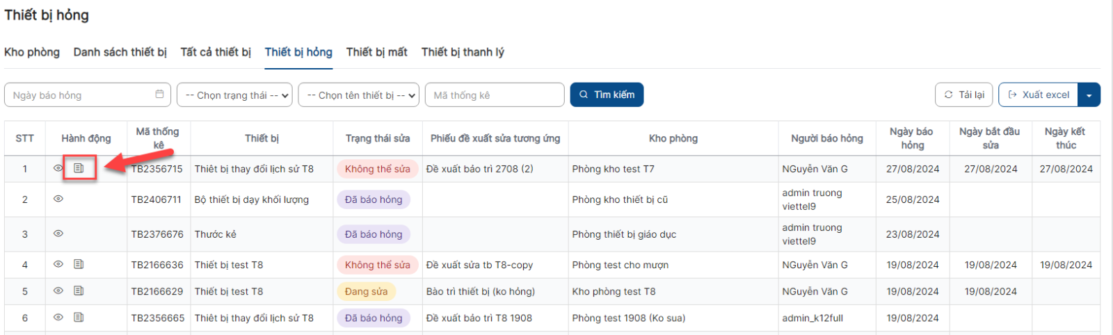 - Click icon Báo cáo tình trạng để thực hiện Báo hỏng/ Báo hết/ Báo mất thiết bị