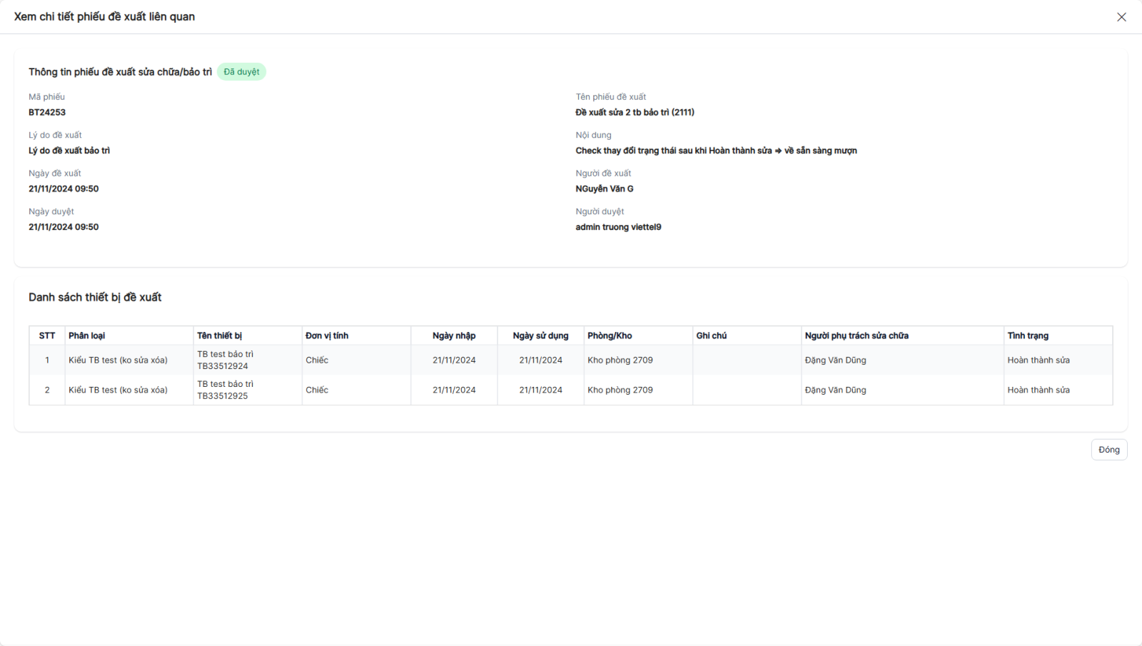 Bước 2: Hiển thị xem chi tiết phiếu đề xuất liên quan thành công