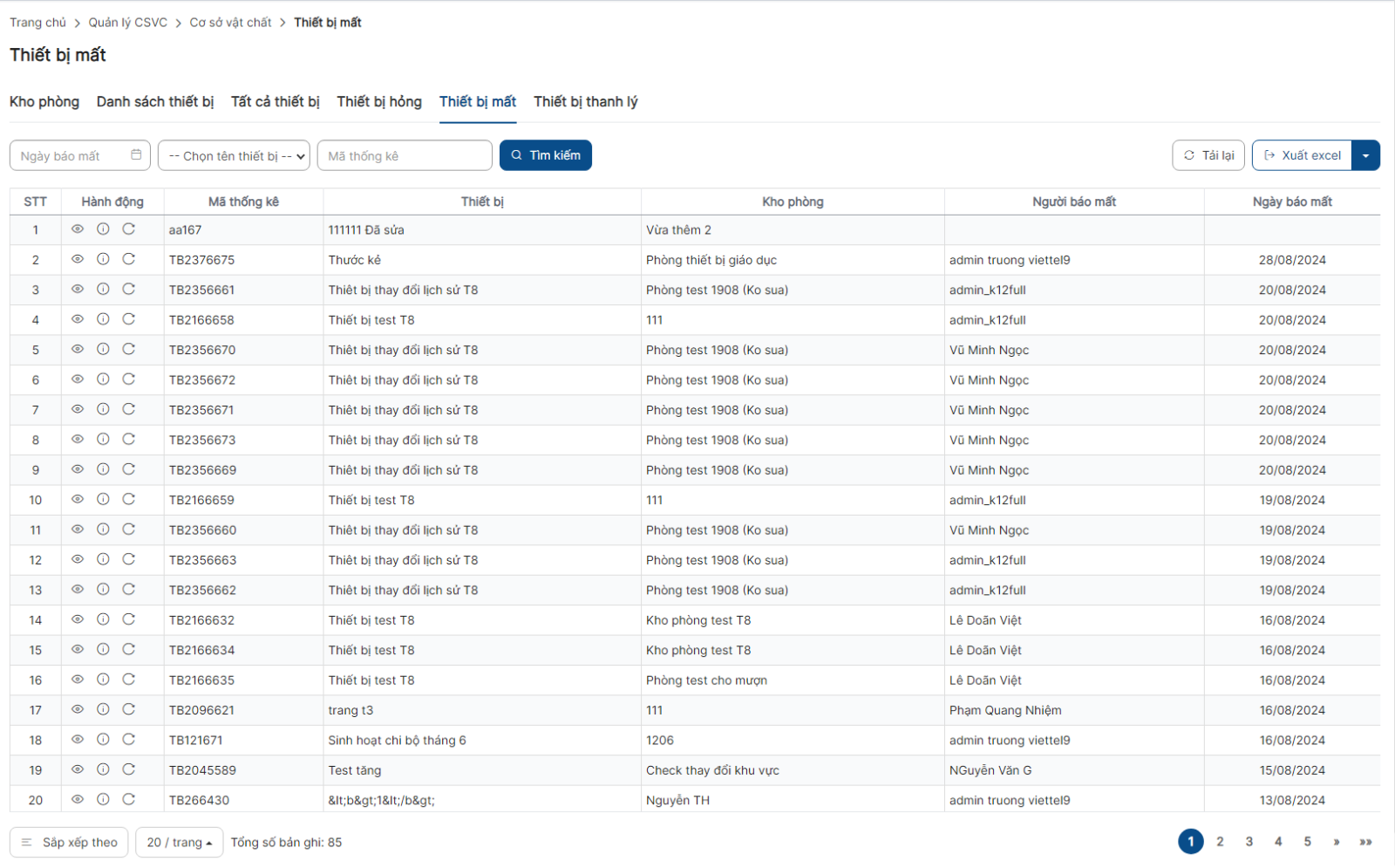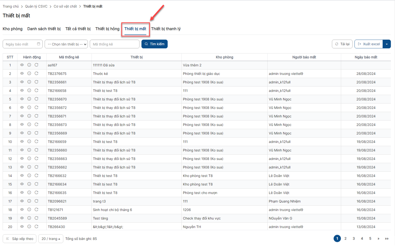 Bước 1: Menu Quản lý CSVC > Click tab Thiết bị mất