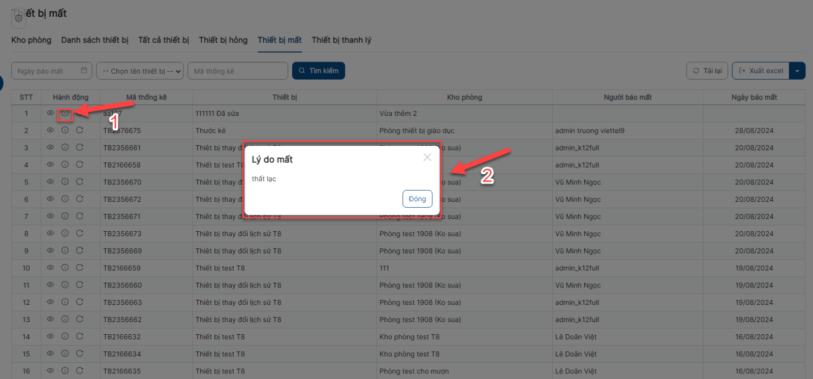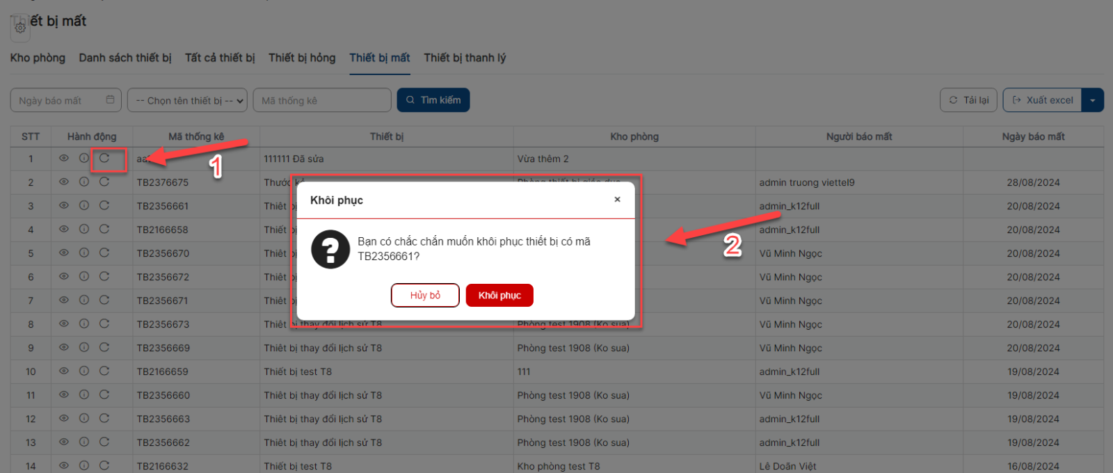 + Click Khôi phục để xác nhận khôi phục thiết bị mất, bản ghi sẽ khôi phục lại trạng thái trước khi báo mất và không còn ở danh sách thiết bị mất