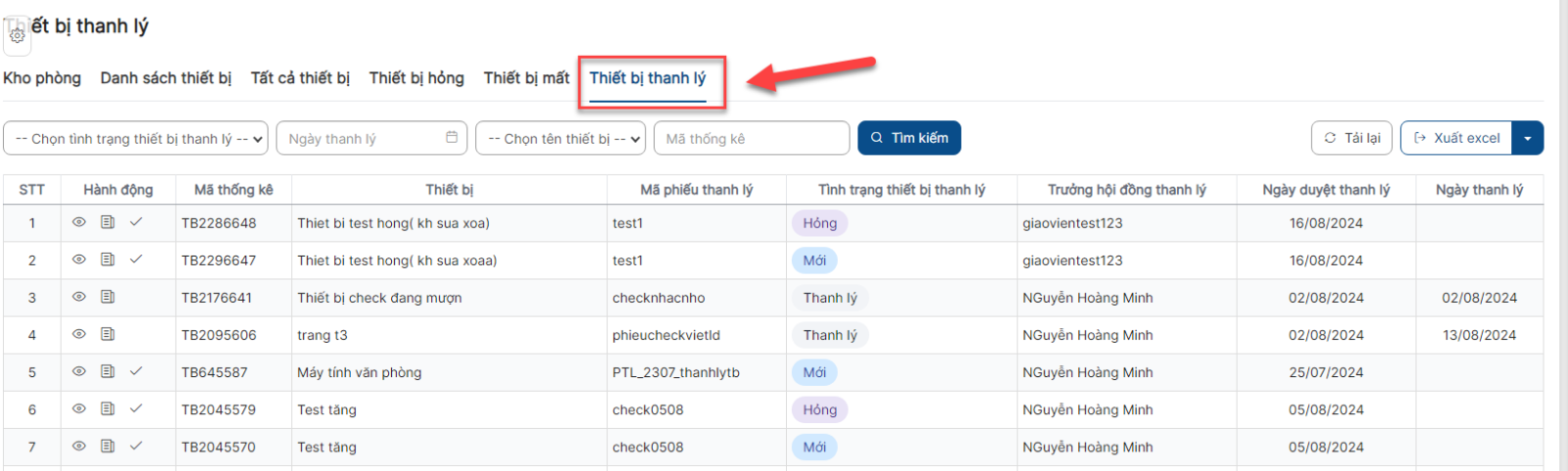 Bước 1: Menu Quản lý CSVC > Click tab Thiết bị thanh lý