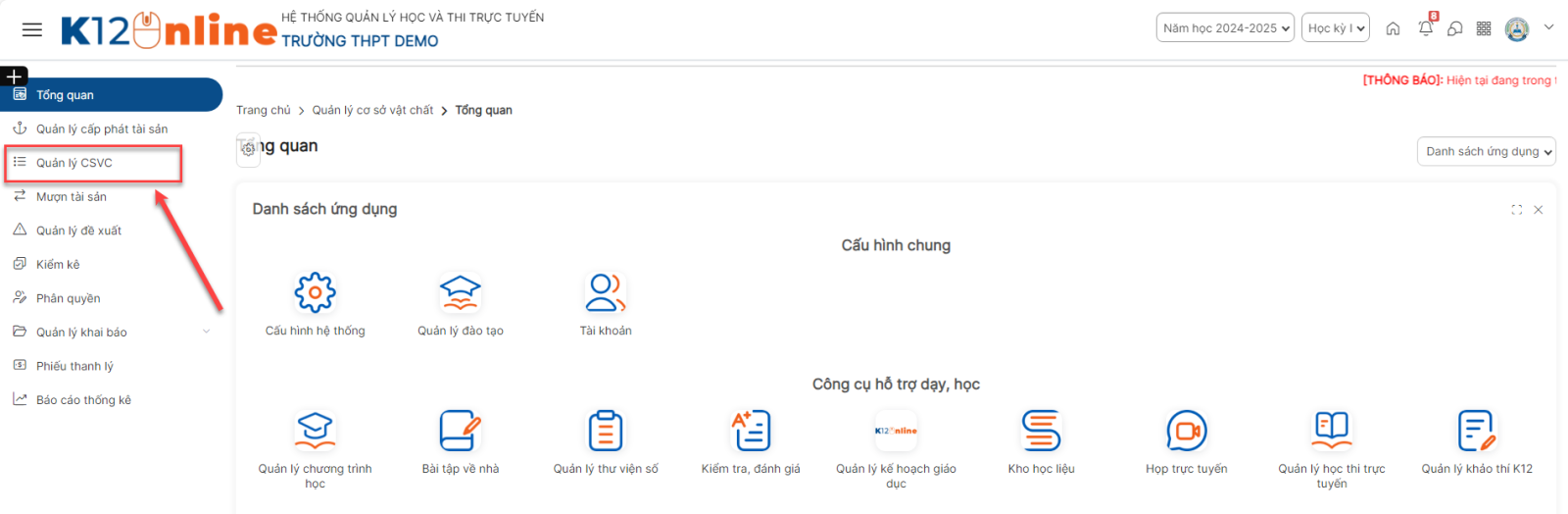 Bước 2: Trang chủ > Click module Quản lý cơ sở vật chất