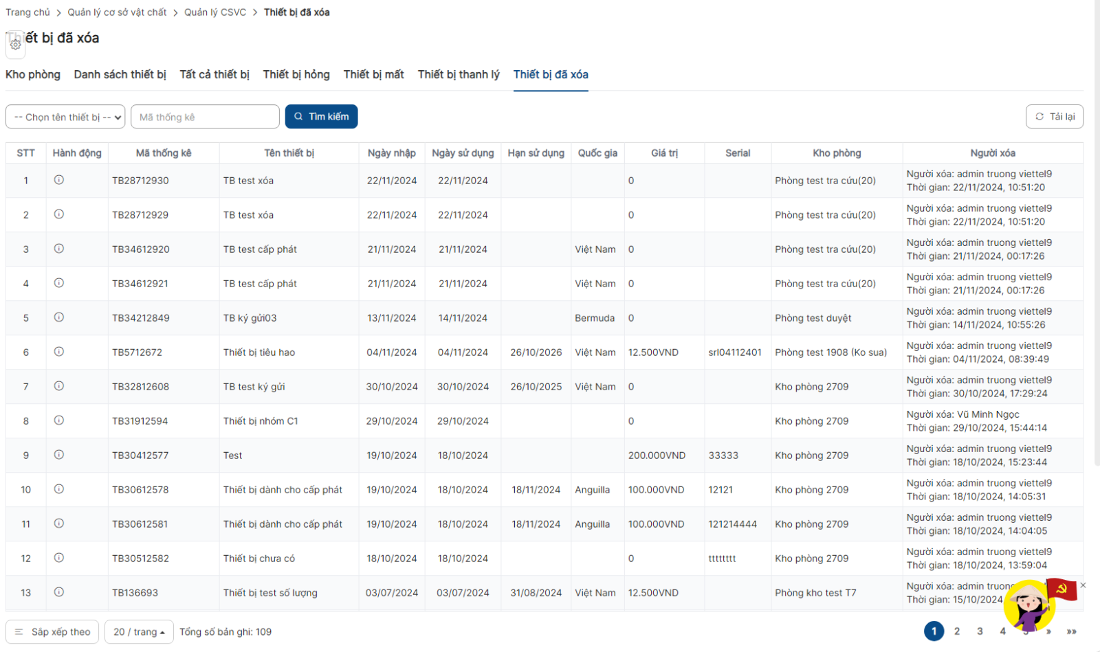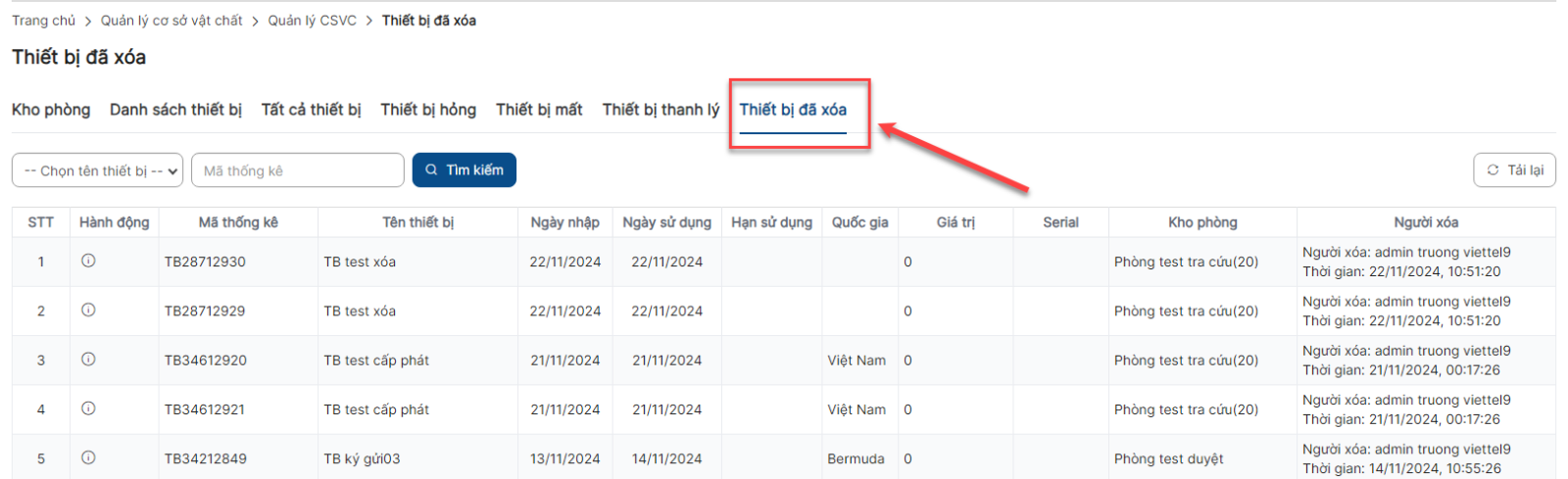 Bước 1: Menu Quản lý CSVC > Click tab Thiết bị đã xóa