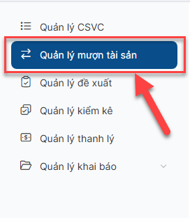 Bước 1: Menu mượn tài sản> Chọn tab Quản lý lịch mượn trả thiết bị