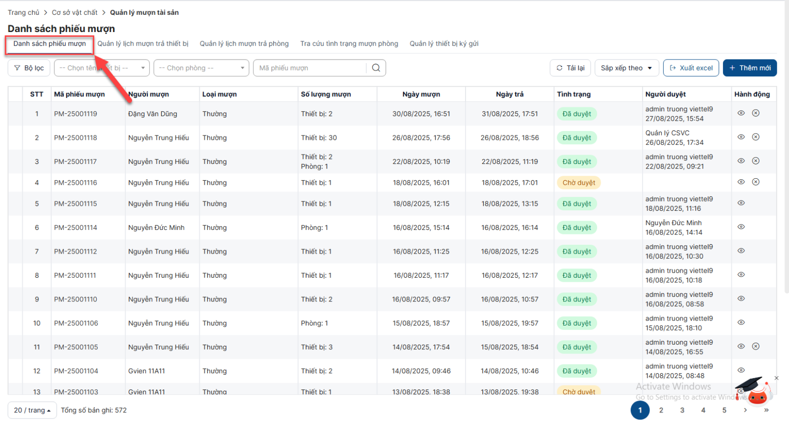 Bước 1: Menu Mượn tài sản> Chọn tab Danh sách phiếu mượn