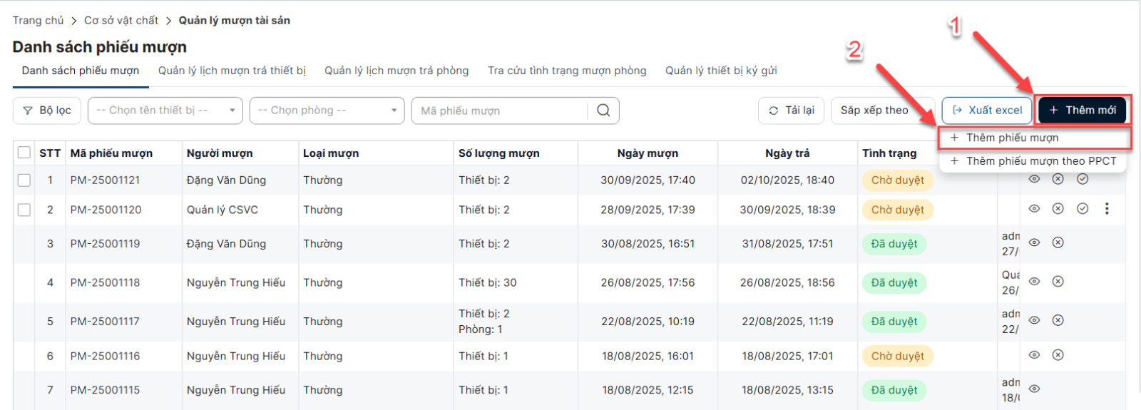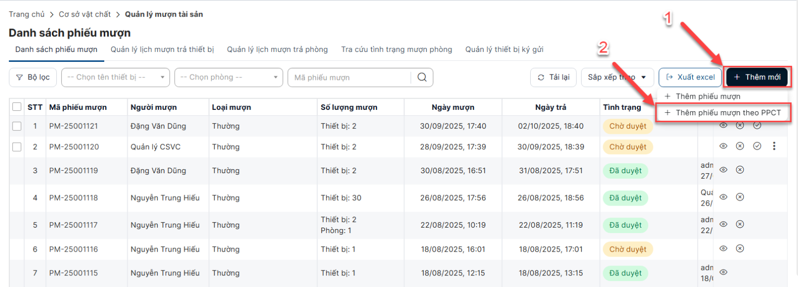 Bước 1: Trên danh sách > Click button Thêm mới> Click Thêm phiếu mượn theo PPCT