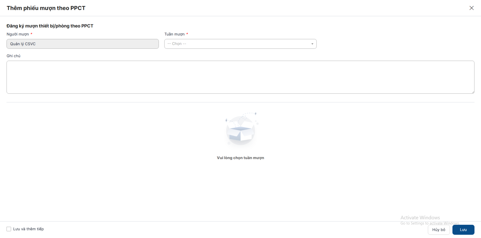 - Tuần mượn: List các giá trị theo tuần học của năm học. Sau khi chọn hệ thống list ra các ngày học mà Giáo viên có phân phối chương trình (phân phối trương trình ở trạng thái hoạt động ở menu Phân phối chương trình). Chỉ thêm được phiếu khi tuần học và ngày học chưa kết thúc.