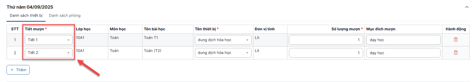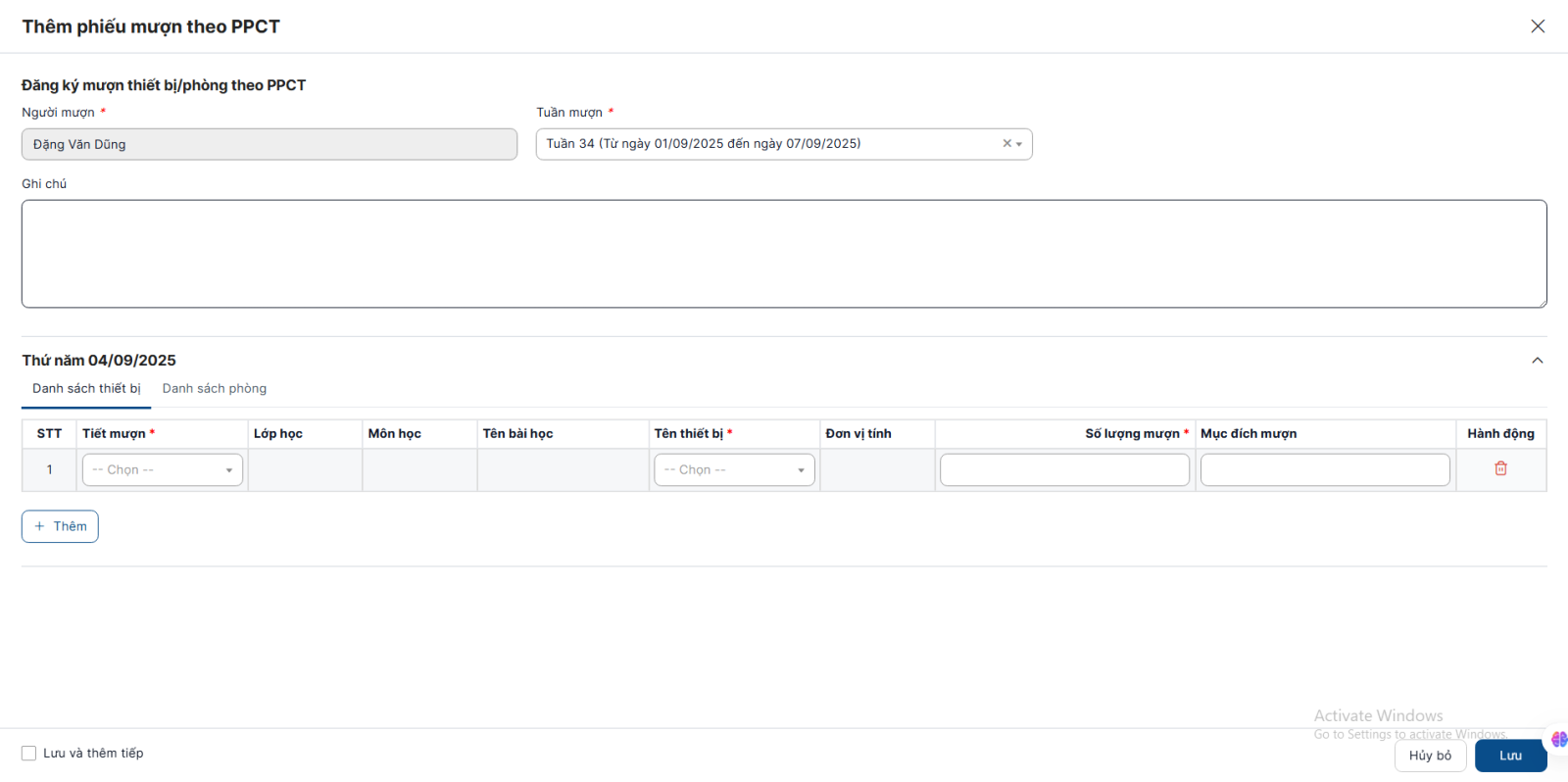 - Đặc biệt: Trường hợp thêm nhiều tiết mượn trong cùng 1 màn hình thêm mới phiếu mượn theo PPCT, thì sau khi lưu, mỗi tiết mượn sẽ được tách thành 1 phiếu mượn riêng biệt với thời gian mượn là thời gian diễn ra tiết học tương ứng.